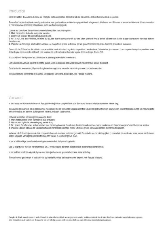 Dieses Werk beschreibt in der Tradition von Respighis Fontane di Roma die Stadt Barcelona zu verschiedenen Tageszeiten. Trencadís ist von dem gleichnamigen Mosaikstil inspiriert, den der berühmte spanische Architekt Gaudí in seinen Gebäuden und seiner architektonischen Kunst oftmals verwendete. Dementsprechend sind die Instrumentierung und die Harmonik sehr farbenfroh, wobei der katalanischen Hymne El Virolai eine besondere Bedeutung zukommt. Verleihen Sie Ihrem nächsten Konzert einen spanischen Touch!