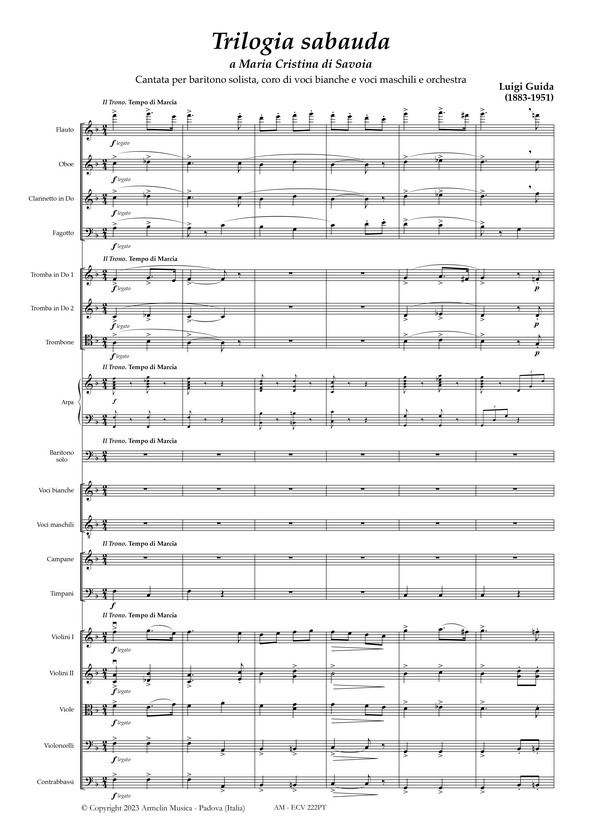 Per Baritono, Coro di voci bianche, Coro di voci maschili e Orchestra. Partitura