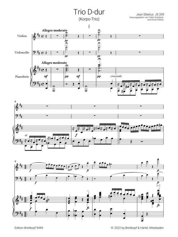 Urtext nach der Gesamtausgabe 'Jean Sibelius Werke' (JSW) Die 'großen' Trios, darunter das Havträsk- und das Korpo-Trio (JS 207, JS 209), wurden für die klassische Klaviertriobesetzung Vl, Vc und Klavier geschrieben. Es scheint, dass Sibelius stets Trios komponierte, um sie in seinem Familien- und Freundeskreis zu spielen, wobei er im Sinn hatte, selbst einer der Musiker zu sein. Kammermusik war ein wesentlicher Teil des sozialen Lebens. Dass das Repertoire auch viele Werke der Wiener Klassik einschloss, kann man in Sibelius Trios nicht überhören. Obwohl Sibelius Beziehung zu seinen Jugendwerken nicht unkompliziert war, berichtete der Sibelius-Biograf Otto Andersson später 'dass der Meister [das Korpo-Trio] in seinen späteren Jahren sehr vermisste und sehr erfreut gewesen wäre, wenn er gesehen hätte, dass [es] erhalten ist'.