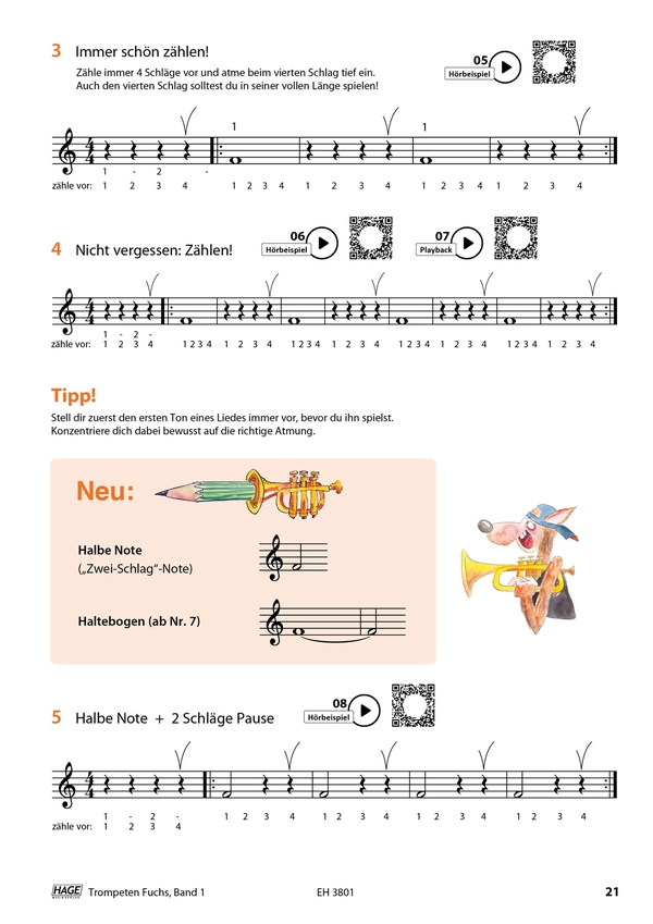 Trompetenfuchs Spielerisch und mit Begeisterung erlernen die Anfänger Schritt für Schritt das Trompetenspiel. Viele neue, aber auch bewährte methodische Wege sind in diese Schule eingearbeitet. Der Trompeten Fuchs gehört mittlerweile zu den erfolgreichsten Trompetenschulen der letzten Jahre. Die komplette Schule umfasst 3 Bände. Ideal für den Einzel- oder Gruppenunterricht und das Selbststudium. Auch geeignet für Flügelhorn, Kornett oder Tenorhorn. Internationale Spitzenlehrer wie Reinhold Friedrich und Bo Nielsson empfehlen diese Schule. Warum? Weil das Konzept des Trompeten Fuchs wirklich funktioniert. Unzählige tolle Solostücke und Duette, musikalisch wertvolle Etüden, technische-, flexibilitäts- und ansatzaufbauende Übungen sowie ein lyrisch-sanglicher Zugang zur Kunst des Trompetenspiels tragen mit dazu bei, dass die Schüler nicht nur gut spielen, sondern auch gut klingen. Markenzeichen dieser Schule ist auch ihr Humor: Mit zahlreichen Comics lenkt der Autor die Aufmerksamkeit der Schüler und Lehrer dorthin, wo sie sein sollte: Zur Freude am Musizieren. Mit über 140 tollen Hörbeispielen und Playbacks macht es Spaß zu spielen. Die Audiobeispiele werden per QR-Code aufgerufen, die man ganz einfach über Smartphone oder Tablet abspielen kann. Die Titel wurden von Stefan Dünser eingespielt.