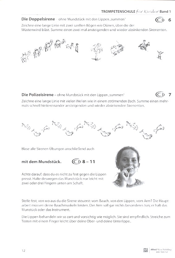 Die erfrischende neue Unterrichtsmethode für Kinder ab 6 Jahren auch geeignet für Kornett und Flügelhorn Diese liebevoll und fantasievoll konzipierte Trompetenschule für Kinder unterscheidet sich von den herkömmlichen Trompetenschulen grundlegend. Sie geht von der Erlebnis- und Gedankenwelt der Kinder aus, spricht die kindliche Fantasie an mit altersgemäßen Texten und Illustrationen, ohne dabei je kindisch zu werden. Von Beginn an wird größter Wert gelegt auf einen bewusst geformten Ton, der leicht von den Lippen geht. Auf einen gründlichen Ausbau der Tonqualität in der mittleren und tiefen Lage wird besonders Wert gelegt. Kinder wollen etwas mit den Händen tun, deshalb werden die Ventile sehr früh in einer durchdachten und erprobten Reihenfolge eingeführt und verwendet (in Band 1 chromatisch abwärts vom c bis zum kleinen fis und dann in Bindungen zum 2. Oberton hinauf bis zum g). Dies führt zum chromatischen Spiel von Anfang an und verhindert das Aufkommen der gerade bei Bläsern sonst weit verbreiteten Angst vor Vorzeichen. Die Funktionsweise der Ventile und die Reihenfolge der Griffe (in chromatischen Passagen) geht so bald in Fleisch und Blut über. Ausgesuchte Liedtexte helfen dabei, die verschiedenen Rhythmen intuitiv zu erfassen und zu spielen. Es ist hilfreich, alle Übungen mit Text zuerst einmal rhythmisch akzentuiert zu singen und/oder zu sprechen. Texte und Titel der kleinen Musiken wecken die Motivation aus sich selbst heraus. An die Stelle von langweiligen Übungen treten Musikstücke, die mit Fantasie und Darstellungswillen gespielt werden wollen und können. Die Aufforderung, immer wieder beim Spielen im Raum herum zu gehen, zielt auf eine lockere, freie Haltung, ohne die der Ton kaum lebendig und ausdrucksstark werden kann. Alles, was wir auf den Lippen summen und mit dem Mundstück und mit der Trompete blasen, ist Musik, lebendiger Ausdruck einer Persönlichkeit, sich selbst und anderen zur Freude. Die Trompetenschule für Kinder wurde zwar speziell für jüngere Anfänger im Alter ab ca. 6 Jahren geschrieben, aber selbstverständlich können auch Jugendliche und Erwachsene mit ihr leicht und sicher Trompete lernen.