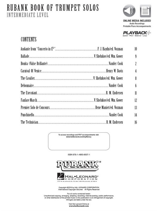 Rubank Book of Solos Rubank Educational Library Andante from Concerto in Es (Haydn) Ballade (Shelukov) Bonita (Valse brillante) (Vander Cook) Carnival of Venice (Davis) The Cavalier (Shelukov) Debonnaire (Vander Cook) The Executant (Endresen) Fanfare March (Shelukov) Premier Solo de Concours (Maniet) Punchinello (Vander Cook) The Technician (Vander Cook) HL4479895