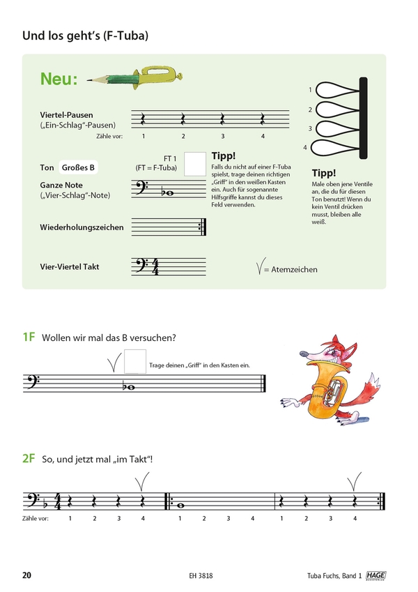 Kreidl, Werner, Koautor Tubafuchs Mit dem Tuba Fuchs erlernen Anfänger Schritt für Schritt spielerisch und mit Begeisterung das Tubaspiel. Eine Menge neue, aber auch bewährte Methoden sind in diese Schule eingearbeitet. Internationale Spitzenlehrer wie Reinhold Friedrich und Bo Nielsson empfehlen diese Schulreihe. Warum? Weil die Konzepte der Fuchs-Serie wirklich funktionieren. Viele tolle Solostücke und Duette, musikalisch wertvolle Etüden, technische-, flexibilitäts und ansatzaufbauende Übungen sowie ein lyrisch-sanglicher Zugang zur Kunst des Tubaspiels tragen mit dazu bei, dass die Schüler nicht nur gut spielen lernen, sondern auch gut klingen. Ein Markenzeichen dieser Schule ist auch ihr Humor: Mit zahlreichen Comics lenken der Cartoonist und die Autoren die Aufmerksamkeit der Schüler und Lehrer dorthin, wo sie sein sollte: zur Freude am Musizieren. Zu vielen Übungen gibt es auch tolle Playbacks per QR-Code zum Anhören, die man ganz einfach über Smartphone oder Tablet abspielen kann. So macht das Üben besonders viel Spaß. Der Tuba Fuchs ist für den Einzel- und Gruppenunterricht auf F- und B-Tuba konzipiert. Er kann aber auch für Es- und C-Tuba verwendet werden. Das ausgefuchste Lehrkonzept ist auch für Trompete, Flügelhorn, Klarinette, Posaune, B- und F-Horn erhältlich.