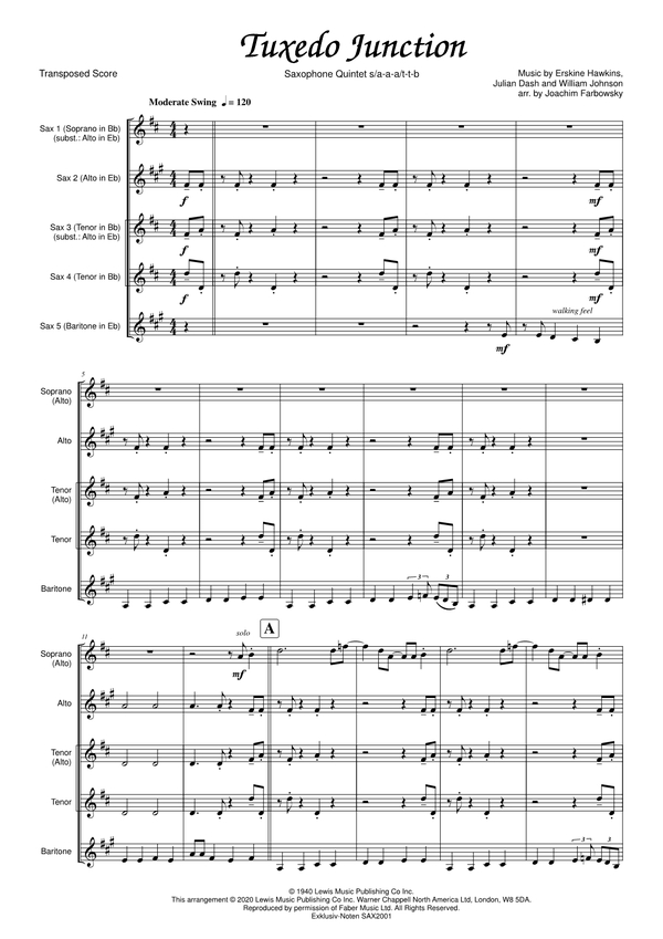 Dash, Julian, Koautor Johnson, William, Koautor Farbowsky, Joachim, arr. Trompeter und Bandleader Erskine Hawkins schrieb den Titel Tuxedo Junction im Jahre 1939 für seine eigene Bigband. Ein Jahr später wurde die bekannteste Version des Stückes von Glenn Miller und seinem Orchester aufgenommen, die in den USA bereits nach kurzer Zeit zum Nummer-1-Hit wurde und in den 1950er Jahren in der Glenn-Miller-Story zu hören war. Joachim Farbowsky arrangierte den Swing-Klassiker vor einiger Zeit für das Osnabrücker Saxophonquintett, wo es einen festen Platz im Repertoire gefunden hat, sich bei etlichen Aufführungen als praxistauglich erwiesen hat und sich beim Publikum stets großer Beliebtheit erfreut. Sein Bestreben war es, den Bigband-Sound in Quintettbesetzung zu präsentieren und dabei möglichst viel vom Original zu erhalten. Daraus resultieren die teilweise etwas artistischen Anforderungen im Tonumfang, wenn in einer Notenzeile zum Beispiel der tiefe Posaunensatz im Wechsel mit den hohen Trompeten abgebildet wird. Durch das moderate Tempo lässt sich dies aber gut in die Praxis umsetzen und macht das Arrangement gerade deshalb umso lebendiger.