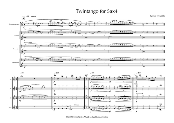 Contemporary Der Titel ist nicht weit hergeholt: Gerald Preinfalk hat dieses Stück seinen Zwillingen nach der Geburt 1999 gewidmet. In dieser Phase hat er ausgiebig mit Klaus Paier am Akkordeon musiziert, der größte musikalische Einfluss kam seinerzeit von Michel Portal und Richard Galliano und das tangoeske ist auch in Preinfalks seinerzeit erstellten Kompositionen eingeflossen. Der Twintango war ursprünglich zweigeteilt, aber gerade der Gegensatz der beiden Stücke zwang den Komponisten, das Stück zu einem Ganzen zusammenzufügen. Preinfalks Affinität zu "viel" Saxophon machte es dann fast schon notwendig, nach wenigen Jahren ein Arrangement zumindest für Saxophonquartett zu schreiben - hier ist es!