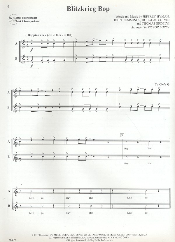 Billie Jean Blitzkrieg Bop Don't stop Believin' Eye of the Tiger Hey Baby Know your Enemy Let's get loud Open Arms I can't get no Satisfaction Wizard Wheezes You raise me up