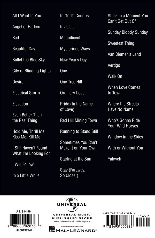 A concise Collection of 40 U2 Songs All I Want Is You Angel Of Harlem Bad Beautiful Day Bullet The Blue Sky City Of Blinding Lights Desire Electrical Storm Elevation Even Better Than The Real Thing Hold Me, Thrill Me, Kiss Me, Kill Me (from the Motion Picture BATMAN FOREVER) I Still Haven't Found What I'm Looking For I Will Follow In A Little While In God's Country Invisible Magnificent Mysterious Ways New Year's Day One One Tree Hill Ordinary Love Pride (In The Name Of Love) Red Hill Mining Town Running To Stand Still Sometimes You Can't Make It On Your Own Staring At The Sun Stay (Faraway, So Close!) Stuck In A Moment You Can't Get Out Of Sunday Bloody Sunday Sweetest Thing Van Diemen's Land Vertigo Walk On When Love Comes To Town Where The Streets Have No Name Who's Gonna Ride Your Wild Horses Window In The Skies With Or Without You Yahweh