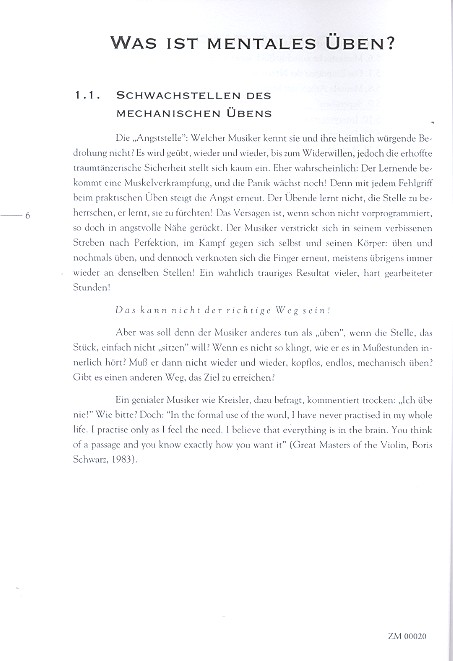 In ihrem Buch beschreibt die Autorin systematische Techniken zur Entspannung und gibt zahlreiche Anregungen zur Gestaltung und zum zeitlichen Ablauf des Übens. Mentales Training kann nicht das Üben mit dem Instrument ersetzen, kann aber un-sinniges Abspulen und den Aufbau von Angststellen verhindern helfen. Das Buch räumt mit überholten Vorstellungen von der Übearbeit auf und versucht, sie durch effektivere zu ersetzen. Ein umfangreiches Literaturverzeichnis gibt Anregungen zur Weiterarbeit und Vertiefung in einzelnen Bereichen.