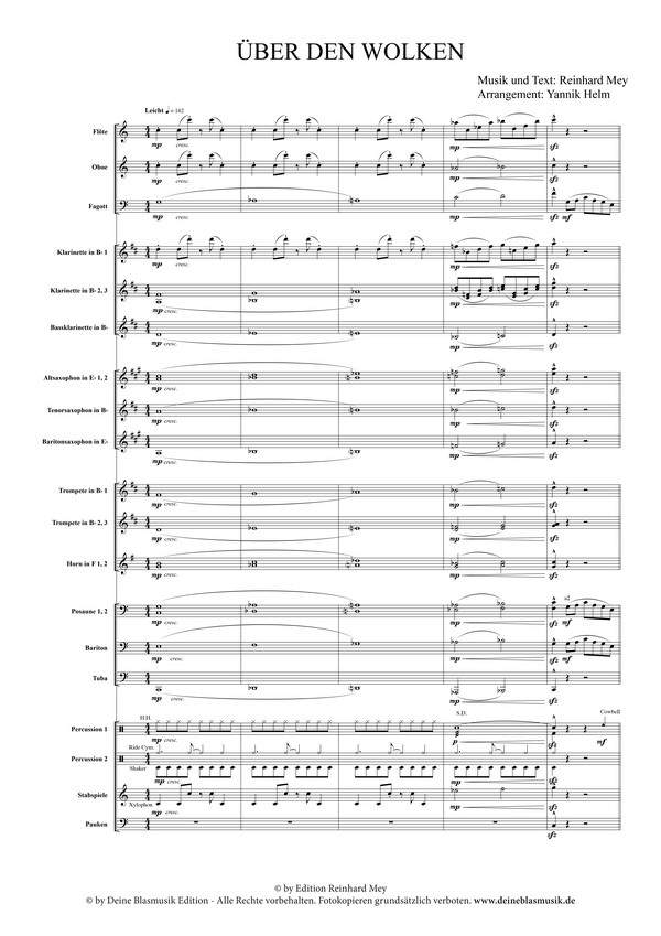 Helm, Yannik, arr. Chanson Über den Wolken ist ganz sicher einer der größten Hits des beliebten Liedermachers Reinhard Mey. Der Arrangeur Yannik Helm zeichnet den Hit ganz neu und gibt ihm ein lateinamerikanisches Flair. Abwechslungsreich gesetzt und instrumentiert, bietet diese Neubearbeitung viele überraschende Momente, die Musikern und Publikum gleichermaßen Spaß und Freude bereiten. Sehr leicht spielbar, gehört dieses Arrangement in die Stammmappe und ist zu jedem Anlass eine echte Bereicherung!