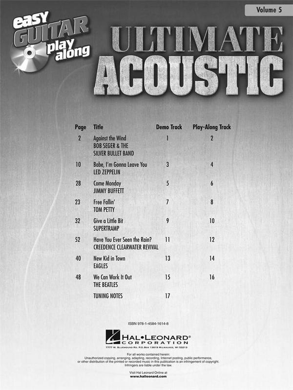 Play 8 Songs with Tab and Sound-alike CD Tracks Against the Wind Babe I'm gonna leave You Come Monday Free Fallin' Give a little bit Have You ever seen the Rain New Kid in Town We can work it out