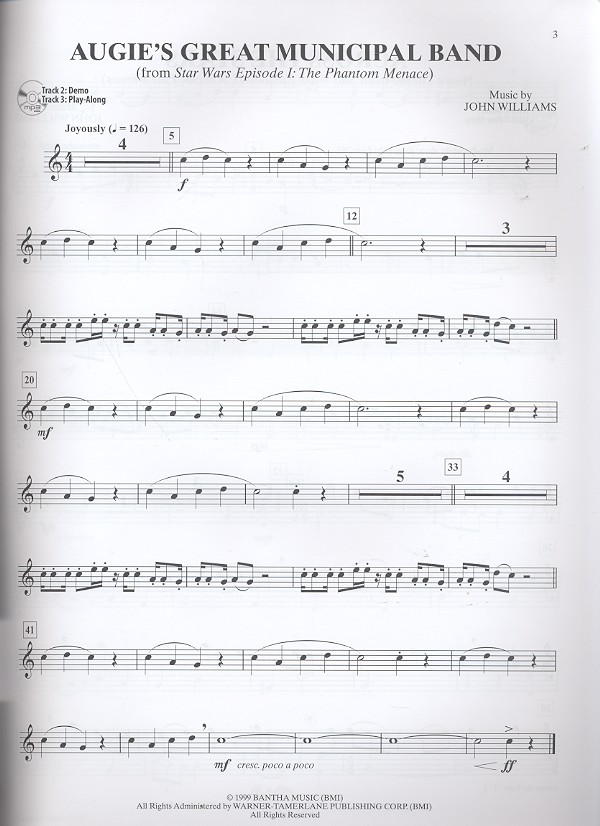 Across the Stars Anakin's Theme The Arena Augie's great municipal Band Battle of the Heroes The black Rider Can you read my Mind Cantina Band Concerning Hobbits Diamonds are forever Ding dong the Witch is dead Double Trouble Duel of the Fates Evenstar Family Portrait Fawkes the Phoenix Follow the yellow Brick Road (We're off to see the Wizard) For your Eyes only From Russia with Love Goldfinger Gollum's Song Gonna fly now Harry's wondrous World Hedwig's Theme I swear If I only head a Brain The imperial March In Dreams James Bond Theme Leaving Hogwart's Lily's Theme Live and let die The Lullaby League (The Lollipop Guild/We welcome You to Munchkinland) Many Meetings Marion's Theme May the Force be with You The Meadow Picnic The merry old Land of Oz Nobody does it better The Notebook Obliviate On her Majesty's Secret Service Optimistic Voices Over the Rainbow The pink Panther Princess Leia's Theme The Prophecy Raiders March Rohan Song from M*A*S*H (Suicide is painless) Star Wars Statues The Stewart of Gondor Theme from Superman The Throne Room Thunderball Tomorrow never dies Wizard Wheezes Wonka's Welcome Song You only live twice