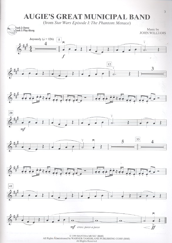 Across the Stars Anakin's Theme The Arena Augie's great municipal Band Battle of the Heroes The black Rider Can you read my Mind Cantina Band Concerning Hobbits Diamonds are forever Ding dong the Witch is dead Double Trouble Duel of the Fates Evenstar Family Portrait Fawkes the Phoenix Follow the yellow Brick Road (We're off to see the Wizard) For your Eyes only From Russia with Love Goldfinger Gollum's Song Gonna fly now Harry's wondrous World Hedwig's Theme I swear If I only head a Brain The imperial March In Dreams James Bond Theme Leaving Hogwart's Lily's Theme Live and let die The Lullaby League (The Lollipop Guild/We welcome You to Munchkinland) Many Meetings Marion's Theme May the Force be with You The Meadow Picnic The merry old Land of Oz Nobody does it better The Notebook Obliviate On her Majesty's Secret Service Optimistic Voices Over the Rainbow The pink Panther Princess Leia's Theme The Prophecy Raiders March Rohan Song from M*A*S*H (Suicide is painless) Star Wars Statues The Stewart of Gondor Theme from Superman The Throne Room Thunderball Tomorrow never dies Wizard Wheezes Wonka's Welcome Song You only live twice