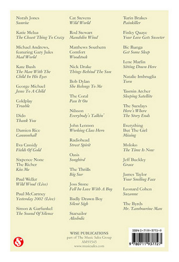 Sunrise (Norah Jones) The closest thing to crazy (Katie Melua) Mad world (Michael Andrews feat. Gary Jules) The man with the child in his eyes (Kate Bush) Trouble (Coldplay) Thank you (Dido) Cannonball (Damien Rice) Fields of gold (Eva Cassidy) Kiss me (Sixpence) Wild wood live (Paul Weller) Yesterday 2002 live (Paul Weller) The sound of silence (Simon and Garfunkel) Wild world (Cat Stevens) Mandolin wind (Rod Stewart) Woodstock (Matthew Southern Comfort) Thing behind the sun (Nick Drake) She belongs to me (Bob Dylan) Pass it on (The Coral) Everybody's talkin' (Nilsson) Working class hero (John Lennon) Street spirit (Radiohead) Songbird (Oasis) Big sur (The Thrills) Fell in love with a boy (Joss Stone) SIlent sigh (Badly drawn boy) Alcoholic (Starsailor) Painkiller (Turin Brakes) Your love gets sweeter (Finley Quaye) Get some sleep (Bic Runga) Sitting down here (Lene Marlin) Torn (Natalie Imbruglia) Sleeping satellite (Tasmin Archer) Here's where the story ends (The Sundays) Missing (Everything but the girl) The times is now (Moloko) Grace (Jeff Buckley) Your smiling face (James Taylor) Suzanne (Leonard Cohen) Mr Tambourine man (The byrds)