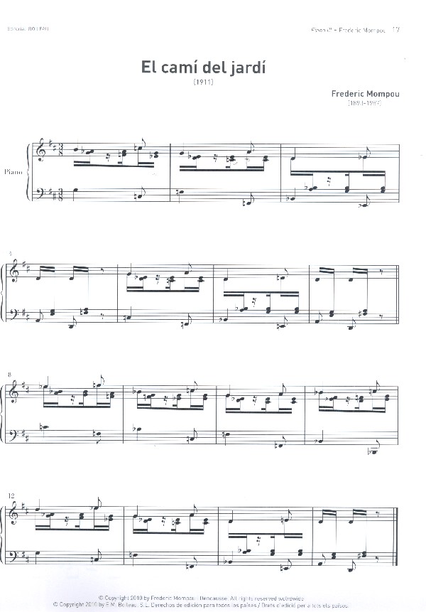 McClure, Mac, ed Masó, Jordi, ed El camí del jardí 2 petits preludis Montseny Preludi Cancó i dansa del pessebre Record de platja Variacions Aura Mazda Fox-trot El plany del captaire Camins de sorra Dansa del tres resi que han caigut del camell Estanys de paper de plata Pensaments El pont de Montjuic Romanca Moderato espressivo Glossa Au clair de la lune Fantasia Au clair de la lune