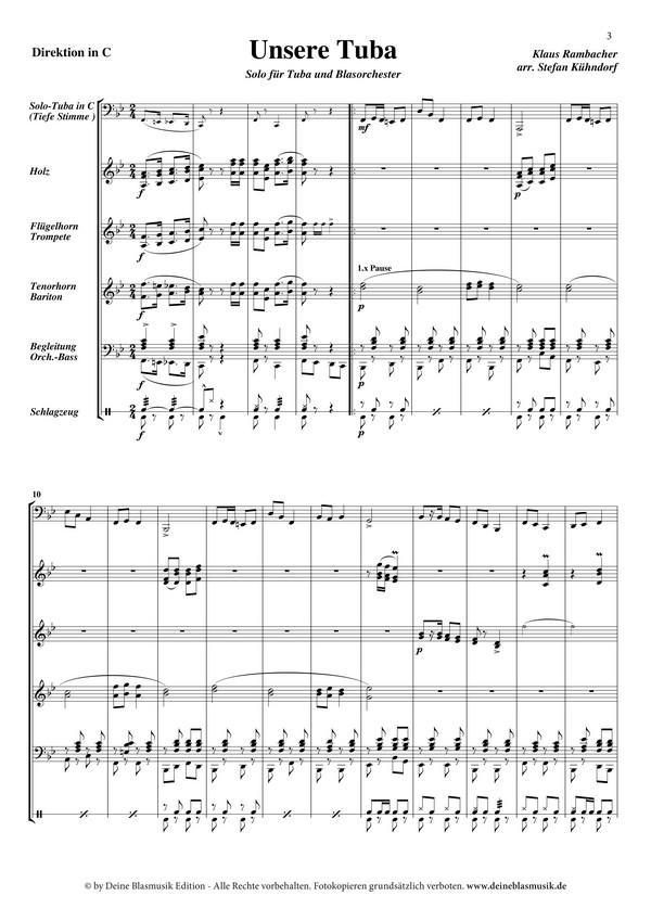 Polka Die Tubisten haben in der Regel ihren Platz in der hinteren Reihe des Orchesters und sind, zusammen mit den Begleitstimmen und dem Schlagzeug, verantwortlich für das Fundament im "Maschinenraum" eines Klangkörpers. Somit fällt den meisten Zuhörern der Bassist eher weniger auf. Umso mehr sollte man ihm die Möglichkeit geben, sich auch mal in der ersten Reihe zu profilieren. Solistische Stücke für Bässe gibt es wohl, aber in den meisten Fällen überfordern sie den Hobby-Musikanten. Anders verhält sich das bei "Unsere Tuba" aus der Feder von Klaus Rambacher. Die böhmische Polka ist ganz bewusst für Mittelstufenorchester konzipiert. Grundsätzlich leicht geschrieben lässt sie dem Solisten dennoch Improvisationsspielraum mit viel "Luft nach oben". Arrangiert wurde das Werk von Stefan Kühndorf, selbst ein glänzender Solist auf seiner Tuba.