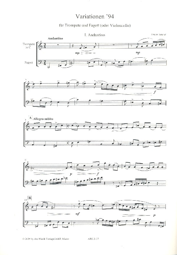 | Untertitel: | für Trompete und Violoncello (Fagott) Spielpartitur |