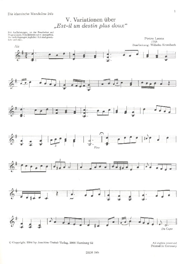 Krumbach, Wilhelm, bearb. Est-il un destin plus doux Le simple jeu La chasse de l'isle Adam Variationen über ein Menuett