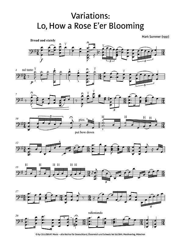 Revised edition Revidierte Fassung Variationen über: Es ist ein Ros entsprungen Mit den Variationen über Es ist ein Ros' entsprungen legt Mark Summers ein Werk vor, das sich einmal auf ganz andere Art diesem weihnachtlichen Traditionslied nähert. Mit Slides, den auch aus Julie-O (PON 1001) bekannten Hammer-Ons, mit akkordischem Pizzicatospiel, Flageoletts und einer Technik, bei der die Saiten mit dem Daumen der rechten Hand angeschlagen werden, verwendet der Komponist effektvolle Spieltechniken, die dem so vertrauten Lied ein neues Klangbild verleihen. Dieses Stück ist eine besondere Programmerweiterung für jedes Weihnachtskonzert und ist auch bestens als Zugabe geeignet. In Zusammenarbeit mit dem Komponisten Mark Summer wurden die Variationen revidiert und vollständig neu gesetzt.
