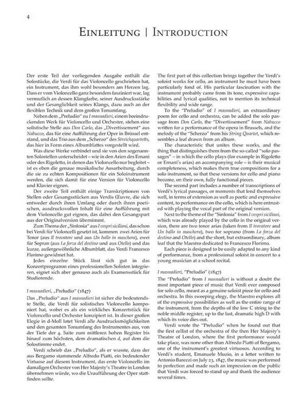 Einige der berühmtesten Stücke aus dem Verdi-Repertoire, geeignet für Profis und Studenten. Die Transkriptionen für Violoncello und Klavier stammen von Giacomo Fossa, die Herausgabe des Soloparts übernahm Sandro Laffranchini, der erste Cellist des Orchesters des Teatro alla Scala. Neben Kompositionen, die der Komponist ausdrücklich für das Violoncello geschrieben hat, wie das Preludio aus I masnadieri, das 2021 wiederentdeckte Divertissement aus Nabucco, das Scherzo aus dem Streichquartett in e-Moll und das Solo aus Ella giammai m'amò, finden sich Transkriptionen von Opernarien und das Francesco Florimo gewidmete Albumblatt, Werke, die sich für eine Aufführung auf dem Violoncello besonders gut eignen. 1. Preludio (from I masnadieri) [Giuseppe Verdi] 2. Divertissement (from Nabucco) [Giuseppe Verdi] 3. Scherzo (from String Quartet in E minor) [Giuseppe Verdi] 4. Ella giammai mamò (from Don Carlo) [Giuseppe Verdi] 5. Ah! sì, ben mio, collessere (from Il trovatore) [Giuseppe Verdi] 6. Tema (from I vespri siciliani, 'Sinfonia') [Giuseppe Verdi] 7. A Florimo [Giuseppe Verdi] 8. Ma se mè forza perderti (from Un ballo in maschera) [Giuseppe Verdi] 9. Pace, pace, mio Dio (from La forza del destino) [Giuseppe Verdi] 10. Ave Maria (from Otello) [Giuseppe Verdi]