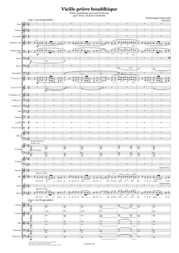 prière quotidienne pour tout l'univers »Vieille Priere Bouddhique« (?Altes buddhistisches Gebet?) zählt zu Lili Boulangers bewegendsten Werken. Die Komposition für Tenorsolo, Chor und Orchester verwendet als Text ein altes buddhistisches tägliches Gebet für das Universum, das sie als Siebenjährige von einer Freundin geschenkt bekam. Diese Meditation über universale Liebe entsprach ihrer intensiven Beschäftigung mit Werten wie Frieden und Glück, und sie vertonte es kurz vor ihrem Tod. Die letzte Strophe des Textes, in dem alle Menschen aufgerufen werden, Frieden und Freude zu erlangen und der sie ihr Leben lang begleitete, lautet: »Mögen alle Frauen, mögen alle Männer, Arier und Nicht-Arier, alle Götter und alle Menschen, und alle, die gestorben sind, ohne Feind, ohne Hindernis, den Schmerz überwinden und glücklich sein, und sich in Freiheit bewegen können, jeder nach seiner Art.« Wie viele ihrer Kompositionen ist auch dieses Werk reich und üppig und zeigt, was für eine unglaublich reife Komponistin sie war. Die Melodien sind teilweise aus den Tönen der Ganztonleiter entwickelt, was dem Werk eine entrückte und beinahe hypnotische Wirkung verleiht. Lili Boulanger (1893-1918) ?Eine Frau, Lilli Boulanger, die 19-jährige Tochter eines Gesangslehrers am Konservatorium, hat den Grand Prix de Rome gewonnen, wobei es das erste Mal in seiner 110-jährigen Geschichte ist, dass eine Frau den heißbegehrten Preis erhielt. Dass unter anderem so bemerkenswerte Komponisten wie Berlioz, Bizet, Gounod, Massenet, Debussy und Charpentier Rompreisträger waren, macht seinen Wert deutlich.? Diese zeitgenössische Pressemeldung zeigt die herausragende Bedeutung der 1893 geborenen Komponistin. Entgegen den damaligen euphorischen Erwartungen hat dies auch über 100 Jahre später noch nicht dazu geführt, sich in der Realität des Konzertbetriebes widerzuspiegeln. Durch ihren frühen Tod im Alter von nur 24 Jahren am 15. März 1918, inmitten der schlimmsten Phase des 1. Weltkriegs, waren die Voraussetzungen kaum vorhanden, überhaupt von der Nachwelt erinnert zu werden. Erschwerend hinzu kamen die Umbruchzeit der 20er Jahre und der 2. Weltkrieg. Ohne die hartnäckige Überzeugungsarbeit ihrer Schwester Nadja Boulanger (1887-1979), die ebenfalls eine erfolgreiche Komponistin war, wäre das Werk dieser genialen jungen Frau vielleicht inzwischen in Vergessenheit geraten. Im Alter von nur 19 Jahren gewann Lili 1913 für die Kantate »Faust et Helene« als erste Frau den ?Grand Prix de Rome?, trotz der Konkurrenz zu namhaften Komponisten und der offenen Frauenfeindlichkeit einiger Jurymitglieder. Ihr Beitrag war mit Abstand der beste unter den Beiträgen. Lili Boulanger gehört mit Debussy, Ravel und Dukas zu den wichtigsten Vertretern des Impressionismus. Trotz ihres nur kurzen Lebens von 24 Jahren entwickelte sie einen charaktervollen Personalstil und schuf mit großer Erfindungskraft unterschiedlichste Werke wie Lieder, Klaviermusik, Opernszenen und Chormusik. Die Verwendung von Ganztonskalen und Pentatonik, mehrdeutigen Tonalitäten und raffinierter, experimenteller Harmonik mit bisweilen bitonalen Andeutungen waren Eigenschaften, die sie mit Debussy teilte. Ihre Betonung der Subtilität durch impressionistische Mittel wie harmonische Mehrdeutigkeit und ihr kluger Einsatz von Klangfarbe und Dynamik führen zu Werken von großer dramatischer Wirkung. Sie war stets darauf bedacht, das Potenzial der Gesangsstimme und der Instrumente voll auszuschöpfen und gezielt einzusetzen. Editorische Hinweise Mehr als 100 Jahre nach der Erstveröffentlichung präsentiert der Inter-Note Verlag die erste moderne Ausgabe dieser herausragenden Komposition. Unsere Ausgabe wurde auf der Grundlage der Erstausgabe von Durand (1924) erstellt, offensichtliche Fehler und Unklarheiten wurden Unklarheiten wurden korrigiert, der Notensatz wurde teilweise an den heutigen Regeln der Textgestaltung und Lesbarkeit angepasst. Unser editorisches Prinzip ?Living Urtext? basiert auf der Erfahrung, dass auch in sorgfältig edierten Ausgaben immer wieder Fehler, Ungenauigkeiten oder Missverständlichkeiten auftauchen, ein URTEXT ist demzufolge nie fertig, sondern bleibt ein lebendiger editorischer Prozess. Da alle unsere Druckausgaben im ?Print-On-Demand? Verfahren hergestellt werden, also nicht in Großauflagen gedruckt werden, können wir immer auf das professionelle feedback der Anwender (Dirigenten, Insturmentalisten, Musikwissenschaftler, Musikpädagogen u.a.) reagieren und dieses in den herausgegebenen Text mit einfließen lassen.