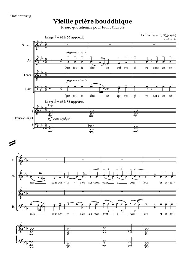 Vieille prière bouddhique »Vieille Priere Bouddhique« (?Altes buddhistisches Gebet?) zählt zu Lili Boulangers bewegendsten Werken. Die Komposition für Tenorsolo, Chor und Orchester verwendet als Text ein altes buddhistisches tägliches Gebet für das Universum, das sie als Siebenjährige von einer Freundin geschenkt bekam. Diese Meditation über universale Liebe entsprach ihrer intensiven Beschäftigung mit Werten wie Frieden und Glück, und sie vertonte es kurz vor ihrem Tod. Die letzte Strophe des Textes, in dem alle Menschen aufgerufen werden, Frieden und Freude zu erlangen und der sie ihr Leben lang begleitete, lautet: »Mögen alle Frauen, mögen alle Männer, Arier und Nicht-Arier, alle Götter und alle Menschen, und alle, die gestorben sind, ohne Feind, ohne Hindernis, den Schmerz überwinden und glücklich sein, und sich in Freiheit bewegen können, jeder nach seiner Art.« Wie viele ihrer Kompositionen ist auch dieses Werk reich und üppig und zeigt, was für eine unglaublich reife Komponistin sie war. Die Melodien sind teilweise aus den Tönen der Ganztonleiter entwickelt, was dem Werk eine entrückte und beinahe hypnotische Wirkung verleiht. *** Lili Boulanger (1893-1918) ?Eine Frau, Lilli Boulanger, die 19-jährige Tochter eines Gesangslehrers am Konservatorium, hat den Grand Prix de Rome gewonnen, wobei es das erste Mal in seiner 110-jährigen Geschichte ist, dass eine Frau den heißbegehrten Preis erhielt. Dass unter anderem so bemerkenswerte Komponisten wie Berlioz, Bizet, Gounod, Massenet, Debussy und Charpentier Rompreisträger waren, macht seinen Wert deutlich.? Diese zeitgenössische Pressemeldung zeigt die herausragende Bedeutung der 1893 geborenen Komponistin. Entgegen den damaligen euphorischen Erwartungen hat dies auch über 100 Jahre später noch nicht dazu geführt, sich in der Realität des Konzertbetriebes widerzuspiegeln. Durch ihren frühen Tod im Alter von nur 24 Jahren am 15. März 1918, inmitten der schlimmsten Phase des 1. Weltkriegs, waren die Voraussetzungen kaum vorhanden, überhaupt von der Nachwelt erinnert zu werden. Erschwerend hinzu kamen die Umbruchzeit der 20er Jahre und der 2. Weltkrieg. Ohne die hartnäckige Überzeugungsarbeit ihrer Schwester Nadja Boulanger (1887-1979), die ebenfalls eine erfolgreiche Komponistin war, wäre das Werk dieser genialen jungen Frau vielleicht inzwischen in Vergessenheit geraten. Im Alter von nur 19 Jahren gewann Lili 1913 für die Kantate »Faust et Helene« als erste Frau den ?Grand Prix de Rome?, trotz der Konkurrenz zu namhaften Komponisten und der offenen Frauenfeindlichkeit einiger Jurymitglieder. Ihr Beitrag war mit Abstand der beste unter den Beiträgen. Lili Boulanger gehört mit Debussy, Ravel und Dukas zu den wichtigsten Vertretern des Impressionismus. Trotz ihres nur kurzen Lebens von 24 Jahren entwickelte sie einen charaktervollen Personalstil und schuf mit großer Erfindungskraft unterschiedlichste Werke wie Lieder, Klaviermusik, Opernszenen und Chormusik. Die Verwendung von Ganztonskalen und Pentatonik, mehrdeutigen Tonalitäten und raffinierter, experimenteller Harmonik mit bisweilen bitonalen Andeutungen waren Eigenschaften, die sie mit Debussy teilte. Ihre Betonung der Subtilität durch impressionistische Mittel wie harmonische Mehrdeutigkeit und ihr kluger Einsatz von Klangfarbe und Dynamik führen zu Werken von großer dramatischer Wirkung. Sie war stets darauf bedacht, das Potenzial der Gesangsstimme und der Instrumente voll auszuschöpfen und gezielt einzusetzen. Editorische Hinweise Mehr als 100 Jahre nach der Erstveröffentlichung präsentiert der Inter-Note Verlag die erste moderne Ausgabe dieser herausragenden Komposition. Unsere Ausgabe wurde auf der Grundlage der Erstausgabe von Durand (1924) erstellt, offensichtliche Fehler und Unklarheiten wurden Unklarheiten wurden korrigiert, der Notensatz wurde teilweise an den heutigen Regeln der Textgestaltung und Lesbarkeit angepasst. Unser editorisches Prinzip ?Living Urtext? basiert auf der Erfahrung, dass auch in sorgfältig edierten Ausgaben immer wieder Fehler, Ungenauigkeiten oder Missverständlichkeiten auftauchen, ein URTEXT ist demzufolge nie fertig, sondern bleibt ein lebendiger editorischer Prozess. Da alle unsere Druckausgaben im ?Print-On-Demand? Verfahren hergestellt werden, also nicht in Großauflagen gedruckt werden, können wir immer auf das professionelle feedback der Anwender (Dirigenten, Insturmentalisten, Musikwissenschaftler, Musikpädagogen u.a.) reagieren und dieses in den herausgegebenen Text mit einfließen lassen.