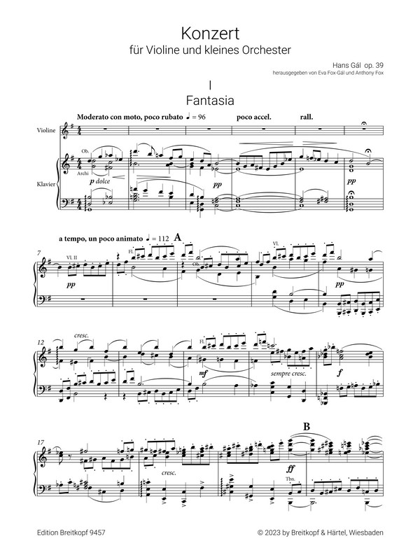 Gál komponierte sein Violinkonzert 1931/32 auf der Höhe seiner Laufbahn. 1929 war er als international angesehener Komponist zum Direktor der Musikhochschule Mainz berufen worden. Das neue Konzert wurde sofort veröffentlicht und im Februar 1933 unter Fritz Busch mit dem Geiger Georg Kulenkampff erfolgreich uraufgeführt. Die Machtergreifung Hitlers bedeutete für Gál als 'Nicht-Arier' jedoch bereits Ende März die fristlose Entlassung aus seinem Amt, Berufs-, Aufführungs- und Verlagsverbot folgten. Gál kehrte in seine österreichische Heimat zurück, floh aber 1938 erneut vor den Nazis, diesmal nach Grobritannien, wo er bis zu seinem Lebensende blieb. Im international radikal veränderten kulturellen Klima der Nachkriegszeit blieb er zwar schöpferisch tätig, wird aber erst in neuester Zeit als Komponist wiederentdeckt. 2005 wurde das Violinkonzert erstmals seit 1933 wieder aufgeführt, überaus erfolgreiche CD-Einspielungen folgten 2010 und 2011. Die einzelnen Orchesterstimmen interagieren kontrapunktisch miteinander und mit der Solostimme. Umso wichtiger ist es für den Interpreten, sich durch den neu herausgegebenen Klavierauszug des Komponisten mit dem Orchesterpart vertraut zu machen.