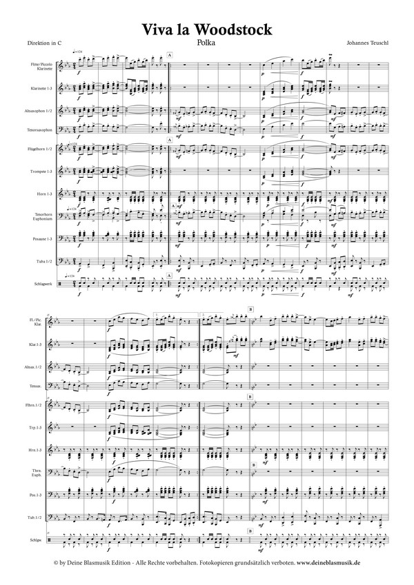 Polka Viva la Woodstock ist eine Hommage des niederösterreichischen Komponisten Johannes Teuschl an das großartige Festival "Woodstock der Blasmusik". Diese flotte Polka bringt mit fetzigen Melodien und abwechslungsreichen Harmonien die Lebensfreude der Festival-Teilnehmer zum Ausdruck. Während im ersten Teil das Blech mit rhythmischen Verschiebungen den Ton angibt, tritt im zweiten Teil das Holzregister in den Vordergrund. Der Trio-Einleitung mit einem fetten Basssolo folgt ein lyrisches Solo im Tenorhorn. Dieses verträumte Thema wird in der Folge vom Flügelhorn und Holz übernommen. Ein wuchtiger Moll-Teil rüttelt uns wieder wach und leitet über zum grandiosen Finale. "Viva la Woodstock" ist der Erfolgsgarant für den nächsten Frühschoppen oder das nächste Konzert. Es lebe die Blasmusik!