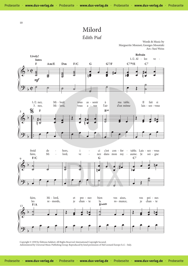 Weiss, Susi, arr. Die Reihe Susis Piano Collection startet mit Musik aus Frankreich. Die Sammlung enthält mittelschwere Bearbeitungen von Susi Weiss aus den Bereichen Filmmusik, Chanson, Valse Musette und French Pop. Enthalten sind neben älteren Lieder von Künstlern wie Édith Piaf, Yves Montand und Gilbert Bécaud auch Songs neueren Datums von Patricia Kaas, Vanessa Paradis und Zaz sowie weltberühmte Filmmusik von Vladimir Cosma, Bruno Coulais und Yann Tiersen. Accordéon (Juliette Gréco) Amsterdam (Jacques Brel) Comptine dun autre été : laprès-midi aus "Amélie" Comptine dété n°2 aus "Amélie" Domino (Louis Ferrari) Ella, elle la (France Gall) Je veux (Zaz) Joe le taxi (Vanessa Paradis) La vie en rose (Édith Piaf) Le moulin aus "Amélie" Mademoiselle chante le blues (Patricia Kaas) Milord (Édith Piaf) Nathalie (Gilbert Bécaud) Padam, Padam (Édith Piaf) Promenade Sentimentale (Vladimir Cosma) Qué vendrá (Zaz) Sous le ciel de Paris (Yves Montand) Sous les ponts de Paris (Lucienne Deyle) Trois petites notes de musique (Yves Montand) Vois sur ton chemin aus "Die Kinder des Monsieur Mathieu"