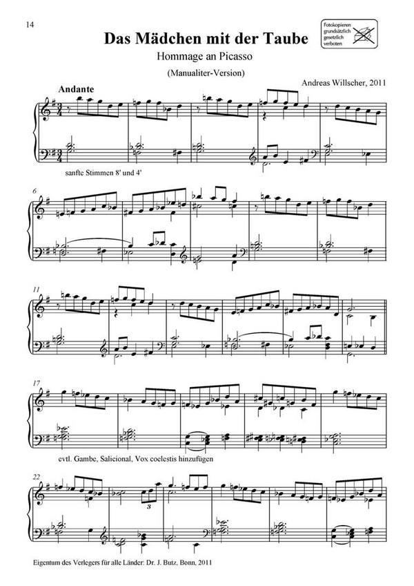 Tiere in der Orgelmusik Band 9 Die Taube mit dem Ölzweig Die Nachtigall Das Rebhuhn Der Rabe Der Pelikan Das Mädchen mit der Taube (Hommage an Picasso) (manualiter) Das Mädchen mit der Taube (Hommage an Picasso) (pedaliter) Der Sperling Der Adler in der Apokalypse