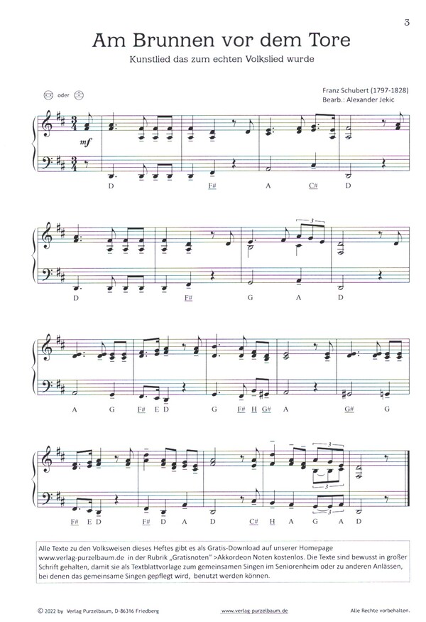 Ausgewählte bekannte Volksweisen Am Brunnen vor dem Tore Die GEdanken sind frei Komm lieber Mai Wenn alle Brünnlein fließen Ännchen von Tharau Guter Mond, du gehst so stille Bunt sind schon die Wälder Ach wie ist's möglich dann Gold und Silber In einem kühlen Grunde Das Lieben bringt groß' Freud Jetzt gang i ans Brünnele Im schönsten Wiesengrunde Sah ein Knab ein Röslein stehn Ich weiß nicht, was soll es bedeuten Kein schöner Land Morgen muß ich fort von hier Ade zur guten Nacht