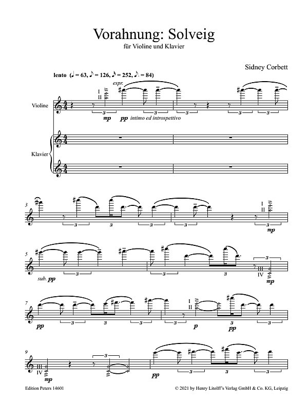 '''Vorahnung: Solveig was commissioned by Theater Halle as the opening sequence to Michal Sedlacek's choreography based on Grieg's ''''Peer Gynt,'''' which premiered in Halle in 2021. The concert premiere took place on May 9, 2025, in Mannheim, with Zoe Pouri (violin) and Shiqi Geng (piano). For my work, I selected fragments from the Solveig aria from Grieg's score and presented them in various altered forms, on the one hand as a premonitory accompanying spirit of the main protagonist, but on the other hand also as an anticipated memory.'''