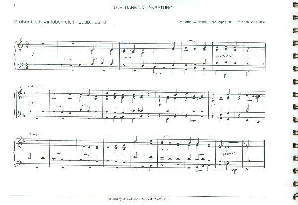 LOB, DANK ANBETUNG Großer Gott, wir loben dich Dein Lob, Herr, ruft der Himmel aus (zwei Versionen) Hoch sei gepriesen unser Gott Nun saget Dank lobt den Herren Lobe den Herren (zwei Versionen) Nun lobet Gott im hohen Thron Den Herren will ich loben (drei Versionen), Nun danket all bringet Ehr (zwei Versionen) Nun danket alle Gott (zwei Versionen) Erde, singe VERTRAUEN TROST Was Gott tut, das ist wohlgetan Wer unterm Schutz des Höchsten steht Wer nur den lieben Gott lässt walten Herr, deine Güt ist unbegrenzt (zwei Versionen) Herr, dir ist nichts verborgen Gott wohnt in einem Lichte (zwei Versionen) SENDUNG NACHFOLGE Alles meinem Gott zu Ehren Wer leben will wie Gott auf dieser Erde 'Mir nach' spricht Christus, unser Held (zwei Versionen) SCHÖPFUNG Erfreue dich, Himmel, erfreue dich, Erde KIRCHE - ÖKUMENE Gott ruft sein Volk zusammen (zwei Versionen) Ein Haus voll Glorie schauet Sonne der Gerechtigkeit (zwei Versionen) O Jesu Christe, wahres Licht Dank sei dir, Vater (zwei Versionen) Nun singe Lob, du Christenheit (zwei Versionen) Ich bin getauft Gott geweiht EUCHARISTIE Das Heil der Welt, Herr Jesus Christ TOD VOLLENDUNG Vater im Himmel, höre unser Klagen (zwei Versionen) O Welt, ich muss dich lassen MARIA Maria, dich lieben Maria aufgenommen ist Meerstern, ich dich grüße Alle Tage sing sage Freu dich, du Himmelskönigin Ave Maria zart Maria, Mutter unsres Herrn Sagt an, wer ist doch diese Christi Mutter stand mit Schmerzen Lasst uns erfreuen herzlich sehr Maria, breit den Mantel aus Gegrüßet seist du, Königin Ave Maria, gratia plena ENGEL Gott, aller Schöpfung heilger Herr Den Engel lasst uns preisen (drei Versionen), HEILIGE Ihr Freunde Gottes allzugleich (zwei Versionen) Wohl denen, die da wandeln Christus, du Licht vom wahren Licht (zwei Versionen) DIE HIMMLISCHE STADT Nun singt ein neues Lied dem Herren Wachet auf, ruft uns die Stimme (zwei Versionen)