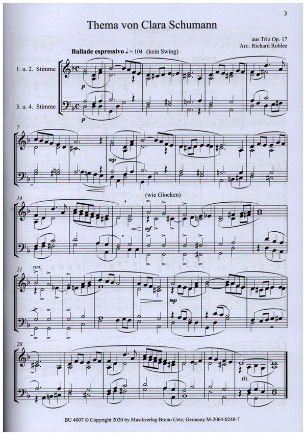 Nach einem Jahr wie dem letzten braucht es ein neues Erwachen! Richard Roblee hat in seiner Abgeschiedenheit Kraft gesammelt, Vorhandenes neu geordnet und Neues geboren. Hier kommt nun sein fröhlicher und optimistischer musikalischer Weckruf an alle Bläser: Wake Up! Neben Vorspielen zu vertrauten Osterchorälen mit Begleitsätzen entstanden viele weitere wunderbare Stücke für alle Gelegenheiten, von Eigenkompositionen und witzigen Bearbeitungen wie Hähnchen klein bis zu bekannten Klassikern wie O sole mio. Gute Laune pur! Transponierte Einzelstimmen sind separat erhältlich, je 9,80: 1./2. Trompete in B, 3. Horn in F, 3./4. Tenorhorn in B. Inhalt: Thema von Clara Schumann aus Trio op. 17 Wake up Morgenlicht leuchtet - Eleanor Farjean Let's get startet The Day begins Christ ist erstanden - Salzburg 1160/1433 Der schöne Ostertag - Joachim Frantz Oudaan, Dirk Raphaelszoon Camphuysen Wir wollen alle fröhlich sein - Hohenfurt 1410 Christ lag in Todesbanden - Martin Luther Bis hierher hat mich Gott gebraucht - Ämilie Juliane ovn Schwarzburg, Peter Sohren Sollt ich meinem Gott nicht singen - Paul Gerhardt, Johann Schopp In dir ist Freude - Cyriakus Schneegraß, Giovanni Giacomo Gastoldi Lobe den Herren, den mächtigen König der Ehren - Joachim Neander, Halle 1741 Mit meinem Gott geh ich zur Ruh - Leipzig 1573 I've got that joy, joy, joy, joy - George William Cooke Ein Chor an der Küste Frische Luft tut gut Willi my boy I looked at you Chirpy Reaching out Keep moving! Hähnchen klein - Franz Wiedemann, Traditional (alle Bearbeitungen sowie Kompositionen von Richard Roblee)