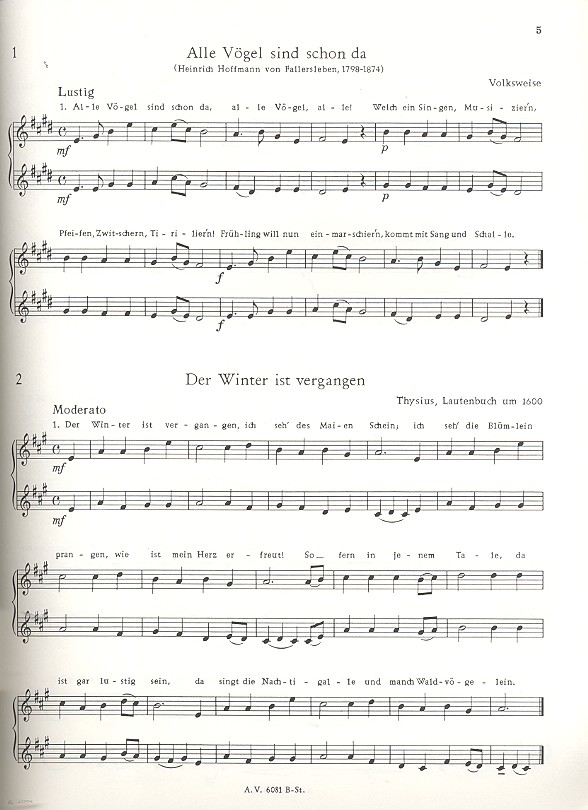 Eine Sammlung deutscher Volkslieder Ach du klarblauer Himmel Ach Schatz, mein Schatz Ach, wie ist's möglich dan (Kücken) Ade zur guten Nacht Alle Vögel sind schon da Als ich gestern einsam ging Als wir jüngst in Regensburg waren Am Brunnen vor dem Tor (Schubert) Am grünen Strand der Spree Am Wald in der Schenke Zum Kürassier An der Saale hellem Strande (Fescat) Ännchen von Tharau (Silcher Auf der Alm, da gibt's koa Sünd Auf der Lüneburger Heide Auf, auf zum fröhlichen Jagen Auf, du junger Wandersmann Auf, ihr Brüder laßt uns wallen Aus der Jugendzeit Aus grauer Städte Mauern Bald gras' ich am Neckar Beim Holderstrauch Beim Kronenwirt Bin ein fahrender Gesell Das Herz am Rhein Das Lieben bringt groß' Freud (Silcher) Das Schweizermadel Das Wandern ist des Müllers Lust (Zöllner) Der Lenz ist angekommen (Silcher) Der Mai ist gekommen Der Mond ist aufgegangen (Schulz) Der Rattenfänger Der Winter ist vergangen Des Sonntags in der Morgenstund Die Gedanken sind frei Die Lore Die Loreley Die Waldschenke Drauß' ist alles so prächtig Drei Lilien Droben im Oberland Drum, Mädchen weine nicht Drunten im Unterland Ein armer Fischer Ein Heller und ein Batzen Ein Jäger aus Kurpfalz Ein Sträußchen am Hute Ein Tiroler wollte jagen Es dunkelt schon in der Heide Es fiel ein Reif in der Frühlingsnacht Es lebt der Schütze froh und frei Es liegt eine Krone Es steht ein Wirtshaus an der Lahn Es tönen die Lieder Es war ein Knabe gezogen Es war im Böhmerwald Es wollt' ein Mädel früh aufsteh'n Es zogen drei Burschen Es, es, es und es Freut euch des Lebens Froh und frei ziehen wir dahin Frühmorgens, wenn die Hähne kräh'n Glück auf! Der Steiger kommt Gold und Silber (Lehar) Gold'ne Abendsonne Grad' aus dem Wirtshaus Grün ist die Heide Gruß aus Ober-Inntal Grüßt mir das blonde Kind am Rhein Guten Abend gute Nacht Hab' mein Wage vollgelade Heiß ist die Liebe Heut' kommt der Hans zu mir Heute wollen wir das Ränzlein schnüren Heute wollen wir marschier'n Hinter einer Gartenmauer Hoch vom Dachstein Horch, was kommt von draußen rein Hört ihr nicht den Ruf erklinge Hört, ihr Herr, und laßt euch sagen I bin a Steirabua Ich bin der Bub vom Elstertal Ich bin ein freier Wildbretschütz Ich habe den Frühling gesehen Ich kam von fern gezogen Ich kenn' ein Tal Ich schieß den Hirsch Ich wand're durch die weite Welt Ich weiß nicht was soll es bedeuten Im Frühtau zu Berge Im grünen Wald dort wo die Drossel singt Im Krug zum grünen Kranze Im Rolandsbogen Im schönsten Wiesengrunde Im tiefen Keller sitz' ich hier Im Wald und auf der Heide Im Wald im grünen Walde In den Schatten dunkler Lauben In der Heimat ist es schön In einem kühlen Grunde Jetzt gang i ans Brünnele (Silcher) Jetzt kommen die lustigen Tage Kehr ich einst in meine Heimat wieder Kein schöner Land in dieser Zeit Keinen Tropfen im Becher mehr Kennt ihr das Land der deutschen Gauen Komm lieber Mai Liebchen, ade Lola Lore Mein' Freud' ist die Mein Mädel hat einen Rosenmund (Brahms) Mein Schlesierland Mit dem Pfeil dem Bogen Morgen muß ich fort von hier Morgen muß ich scheiden prächtiges Berlin Morgen will mein Schatz verreisen Müde kehrt ein Wandersmann zurück Nun ade du mein lieb Heimatland Nun leb' wohl du kleine Gasse Nur einmal blüht im Jahr der Mai O alte Burschenherrlichkeit O Schwarzwald o Heimat O Täler weit o Höhen O, du schöner Westerwald O, wie wohl ist mir am Abend Rosestock Holderblüh' 's ist alles dunkel 's ist Feierabend Sah ein Knab ein Röslein stehn Schön blüh'n die Heckenrosen Schön ist die Jugend Schwarzbraun ist die Haselnuß So leb' denn wohl du stilles Haus So scheiden wir mit Sang und Klang Soll ich dir mein Liebchen nennen Sonntag ist's Steig' ich den Berg hinauf Still ruht der See Stimmt an mit hellem hohem Klang Tirol, Tirol, Tirol Und der Hans schleicht umher Von allen den Mädchen Von dem Berge fließt ein Wasser Von der Wanderschaft zurück Von meinem Bergli muß i scheiden Waldandacht Waldeslust Wandern ach wandern Wann i in der Früh' aufsteh' Wann wir schreiten Seit' an Seit' Warum ist es am Rhein so schön Was die Welt morgen bringt Weh' daß wir scheiden müssen Wem Gott will rechte Gunst erweisen (Fröhlich) Wenn ich den Wand'rer frage Wenn ich einmal der Herrgott wär' Wenn wir marschieren Wenn wir schau'n, schau'n, schau'n Wenn's Maidüfterl weht Wer hat dich du schöner Wald Wer recht in Freude wandern will Wie hat es Gott so schön bedacht Wie herrlich ist's im Wald Wie lieblich schallt durch Busch und Wald Wie's daheim war Wilde Gesellen vom Sturmwind durchweht Winter ade Wir die Welt am Stab durchmessen Wir sind jung die Welt steht offen Wo den Himmel Berge kränzen Wo die Alpenrosen blüh'n Wohin ich wand're durch die Welt Wohlan die Zeit ist kommen Wohlauf die Luft weht frisch und rein Wohlauf in Gottes schöne Welt Wohlauf noch getrunken Zillertal du bist mei' Freud'