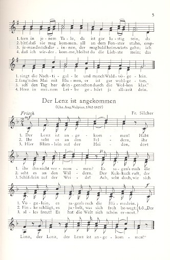 Ach, du klarblauer Himmel Ach, Schatz, mein Schatz Ach, wie ist's möglich dann Ade zur guten Nacht Ännchen von Tharau Alle Vögel sind schon da Als ich gestern einsam ging Als wir jünst in Regensburg waren Am Brunnen vor dem Tore Am grünen Strand der Spree Am Wald in der der Schenke Zum Kürassier An der Saale hellem Strande Auf, auf zum fröhlichen Jagen Auf der Alm, da gibt's koa Sünd Auf der Lüneburger Heide Auf, du junger Wandersmann Auf ihr Brüder laßt uns wallen Aus der Jugendzeit Aus grauer Städte Mauern Bald gras' ich am Neckar Beim Holderstrauch Beim Kronenwirt Bin ein fahrender Gesell Das Herz am Rhein Das Lieben bringt groß Freud Das Schweizermadel Das Wandern ist des Müllers Lust Der Lenz ist angekommen Der Mai ist gekommen Der Mond ist aufgegangen Der Rattenfänger Der Winter ist vergangen Des Sonntags in der Morgenstund' Die Gedanken sind frei Die Lore Die Loreley Die Waldschenke Drauß' ist alles so prächtig Drei Lilien Droben im Oberland Drum, Mädchen, weine nicht Drunten im Unterland Ein armer Fischer Ein Heller und ein Batzen Ein Jäger aus Kurpfalz Ein Sträußchen am Hute Ein Tiroler wollte jagen Es dunkelt schon in der Heide Es, es, es und es Es fiel ein Reif in der Frühlingsnacht Es lebt der Schütze froh und frei Es liegt eine Krone Es steht ein Wirtshaus an der Lahn Es tönen die Lieder Es war ein Knabe gezogen Es war im Böhmerwald Es wollt' ein Mädel früh aufsteh'n Es zogen drei Burschen Freut euch des Lebens Froh und frei ziehen wir dahin Frühmorgens, wenn die Hähne kräh'n Glück auf! Der Steiger kommt Gold'ne Abendsonne Gold und Silber Grad' aus dem Wirtshaus Grün ist die Heide Grüßt mir das blonde Kind am Rhein Gruß aus Ober-Inntal Guten Abend, gute Nacht Hab mein Wage vollgelade Heiß ist die Liebe Heute wollen wir das Ränzlein schnüren Heute wollen wir marschier'n Heut' kommt der Hans zu mir Hinter einer Gartenmauer Hoch vom Dachstein Hört, ihr Herrn, und laßt euch sagen Hört ihr nicht den Ruf erklingen Horch, was kommt von draußen rein I bin a Steirerbua Ich bin der Bub vom Elstertal Ich bin ein freier Wildbretschütz Ich habe den Frühling gesehen Ich kam von fern gezogen Ich kenn' ein Tal Ich schieß den Hirsch Ich wand're durch die weite Welt Ich weiß nicht, was soll es bedeuten Im Frühtau zu Berge Im grünen Wald dort wo die Drossel singt Im Krug zum grünen Kranze Im Rolandsbogen Im schönsten Wiesengrunde Im tiefen Keller sitz' ich hier Im Wald, im grünen Walde Im Wald und auf der Heide In den Schatten dunkler Lauben In der Heimat ist es schön In einem kühlen Grunde Jetzt gang i an's Brünnele Jetzt kommen die lustigen Tage Kehr ich einst in meine Heimat wieder Keinen Tropfen im Becher mehr Kein schöner Land Kennt ihr das Land in deutschen Gauen Komm, lieber Mai Liebchen ade Lola Lore Mein Freud ist die Mein Mädel hat einen Rosenmund Mein Schlesierland Mit dem Pfeil dem Bogen Morgen muß ich fort von hier Morgen muß ich scheiden, prächtiges Berlin Morgen will mein Schatz verreisen Müde kehrt ein Wandersmann zurück Nun ade du mein lieb Heimatland Nun leb' wohl du kleine Gasse Nur einmal blüht im Jahr der Mai O alte Burschenherrlichkeit O, du schöner Westerwald O Schwarzwald o Heimat O Täler weit o Höhen O, wie wohl ist mir am Abend Rosestock, Holderblüh' Sah ein Knab' ein Röslein steh'n Schenk' Mädel mir den Rosenmund Schön blüh'n die Heckenrosen Schön ist die Jugend Schwarzbraun ist die Haselnuß 's ist alles dunkel 's ist Feierabend So leb' denn wohl du stilles Haus Soll ich dir mein Liebchen nennen Sonntag ist's So scheiden wir mit Sang und Klang Steig' ich den Berg hinauf Still ruht der See Stimmt an mit hellem hohem Klang Tirol Tirol Tirol Und der Hans schleicht umher Von allen den Mädchen Von dem Berge fließt ein Wasser Von der Wanderschaft zurück Von meinem Bergli muß ich scheiden Waldandacht Waldeslust Wandern, ach wandern Wann i in der Früh' aufsteh' Wann wir schreiten Seit an Seit Warum ist es am Rhein so schön Was die Welt morgen bringt Weh' daß wir scheiden müssen Wem Gott will rechte Gunst erweisen Wenn ich den Wandrer frage Wenn ich einmal der Herrgot wär' Wenn's Mailüfterl weht Wenn wir marschieren Wenn wir schau'n schau'n schau'n Wer die Welt am Stam durchmessen Wer hat dich du schöner Wald Wer recht in Freuden wandern will Wie hat es Gott so schön bedacht Wie herrlich ist's im Wald Wie lieblich schallt durch Busch und Wald Wie's daheim war Wilde Gesellen vom Sturmwind durchweht Winter ade Wir sind jung die Welt steht offen Wo den Himmel Berge kränzen Wo die Alpenrosen blüh'n Wohin ich wand're durch die Welt Wohlan die Zeit ist kommen Wohlauf die Luft weht frisch und rein Wohlauf in Gottes schöne Welt Wohlauf noch getrunken Zillertal du bist mei' Freud'