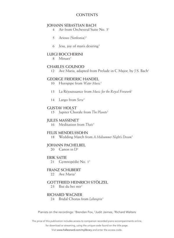 Air (Bach) Arioso (Bach) Jesu Joy of Man's Desiring (Bch) Minuet (Boccherini) Ave Maria (Gounod) Hornpipe (Händel) La réjouissance (Händel) Largo (Händel) Jupiter (Holst) Wedding March (Mendelsohn) Canon (Pchelbel) Gymnopédie no.1 (Satie) Ave Maria (Schubert) Bist du bei mir (Stölzel) Bridal Chorus (Wagner)