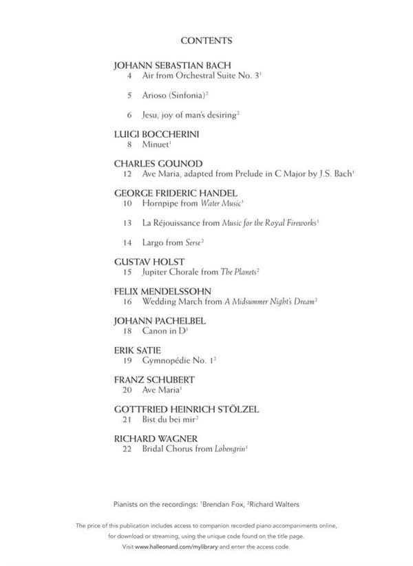 15 classical Wedding Favorites Air (Bach) Arioso (Bach) Jesu Joy of Man's Desiring (Bch) Minuet (Boccherini) Ave Maria (Gounod) Hornpipe (Händel) La réjouissance (Händel) Largo (Händel) Jupiter (Holst) Wedding March (Mendelsohn) Canon (Pchelbel) Gymnopédie no.1 (Satie) Ave Maria (Schubert) Bist du bei mir (Stölzel) Bridal Chorus (Wagner)