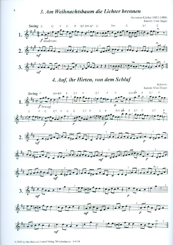 Heger, Uwe, arr. Swingende Weihnachtslieder im Kanon oder Ensemble Alle Jahre wieder Als ich bei meinen Schafen wacht Am Weihnachtsbaum Auf ihr Hirten von dem Schlaf Away in a Manger Der Christbaum ist der schönste Baum Es ist ein Ros entsprungen Es ist für uns eine Zeit angekommen Es kommt ein Schiff geladen Freu dich Erd' und Sternenzelt Freut euch alle Fröhliche Weihnacht überall Fröhlich soll mein Herze springen Go tell it on the Mountain Hark the Herald Angels sing Herbei o ihr Gläubigen Ich steh an deiner Krippen hier Ihr Hirten erwacht Ihr Kinderlein kommet In dulci jubilo Inmitten der Nacht Jingle Bells Josef lieber Josef mein Joy to the World Kling Glöckchen klingelingeling Kommet ihr Hirten Kommt und lasst uns Christum ehren Lasst uns froh und munter sein Leise rieselt der Schnee Les anges dans nos campagnes Lieb Nachtigall wach auf Lobt Gott ihr Christen alle gleich Maria durch ein Dornwald ging Morgen Kinder wird's was geben Morgen kommt der Weihnachtsmann Nun komm der Heiden Heiland O du fröhliche O laufet ihr Hirten O Tannenbaum Stille Nacht heilige Nacht Still still still Süßer die Glocken nie klingen The first Noel Vom Himmel hoch da komm ich her Vom Himmel hoch o Englein kommt Was soll das bedeuten We wish You a merry Christmas Wie soll ich dich empfangen Zu Bethlehem geboren