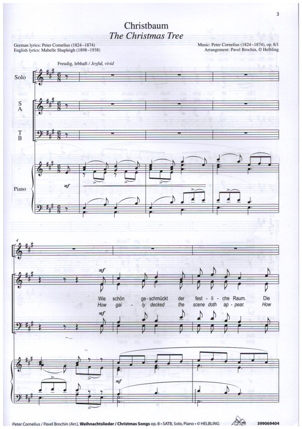 Peter Cornelius war ein vielfältiger "Dichterkomponist?, der mit Franz Liszt und Richard Wagner in gutem Kontakt stand. Seine sechs Weihnachtslieder op. 8 vereinen sich in stimmungsvoller Abwechslung zwischen fröhlichen und getragenen Szenen zu einem besinnlichen und runden zyklischen Ganzen: Die Familie, an Heiligabend unter dem Christbaum sitzend, liest davon, was sich vor langer Zeit in Bethlehem zutrug ? von der Wanderung der Hirten, dem Weg der drei Weisen, der Begegnung der Heiligen Familie mit Simeon auf dem Rückweg nach Jerusalem ? und besinnt sich der Wunder und der Erlösung durch das Christuskind. Die von Cornelius auch gedichtete Liedersammlung zeigt in schöner Art und Weise, worum es beim Fest der Liebe geht und weshalb wir es feiern. Pavel Brochin macht diese Lieder in der vorliegenden, eng am Original angelehnten Bearbeitung einfühlsam den Chören zugänglich. Solostimme und der gut singbare Chorsatz interagieren dabei klanglich ausgesprochen subtil. Inhalt Christbaum / The Christmas Tree Die Hirten / The Shepherds Die Könige / The Kings Simeon Christus der Kinderfreund / Christ the Friend of Children Christkind / The Christ-Child