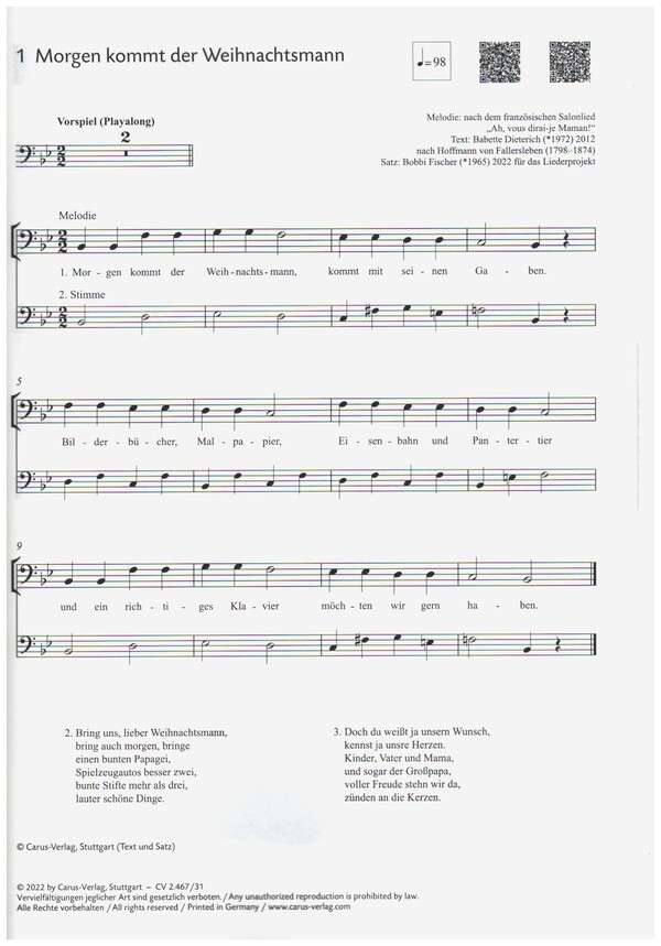 20 leichte Lieder zu Winter, Advent und Weihnachten Für Anfänger und Fortgeschrittene Weigele, Klaus K., ed Was wäre die Weihnachtszeit ohne das gemeinsame Musizieren? Advents-, Weihnachts- und Winterliedern spielen für alle Anfänger auf einem Melodieinstrument eine wichtige Rolle, können sie doch damit bereits im ersten Jahr ihre Fortschritte auf dem Instrument unter Beweis stellen. Und nichts ist dafür besser geeignet als so beliebte und populäre Stücke wie die Weihnachtsklassiker. Die sechs Spielhefte der neuen Publikationsreihe für den Instrumentalunterricht, die in enger Zusammenarbeit mit der Landesakademie für die musizierende Jugend in Baden-Württemberg entstanden sind, enthalten jeweils 20 leichte Lieder in progressiver Folge. Erfahrene Instrumentalpädagog*innen haben für jedes Instrument anhand definierter Kriterien eine Auswahl an Liedern getroffen, die schon nach wenigen Wochen und Monaten im Rahmen des Musikschulunterrichts gemeistert werden können. Alle Lieder sind so ausgewählt und transponiert, dass Tonraum und Griffverbindungen den Schwierigkeitsgrad der ersten drei Unterrichtsjahre nicht überschreiten. Die Klavierbegleitung ist in moderatem Schwierigkeitsgrad gehalten. Zu vielen Liedern wird ad libitum eine Ober- und/oder Unterstimme angeboten, die ebenfalls von Instrumentalschüler*innen übernommen werden kann. Die Spielhefte sind damit sowohl für den Einzel- und Gruppenunterricht geeignet. Grundlage für die Sätze sind die Klavier- und Musizierbände zu den WEIHNACHTSLIEDER-Bänden (Carus 2.403/03 und 2.404/03) aus dem LIEDERPROJEKT, dem Benefizprojekt für das Singen mit Kindern. In den Spielheften sind zu allen Liedern jeweils Singtexte beigegeben, sodass auch dem weihnachtlichen Singen und Musizieren zuhause keine Grenzen gesetzt sind. Allen Spielheften liegt die Klavierbegleitung als Notenausgabe bei, kostenfreie Playalongs werden online angeboten. 20 leichte Lieder zu Winter, Advent und Weihnachten A, a, a, der Winter, der ist da Alle Jahre wieder Lasst uns froh und munter sein Mary had a baby Morgen kommt der Weihnachtsmann Niklas ist ein braver Mann O du fröhliche Away in a manger - Allein in der Krippe Ihr Kinderlein, kommet Kling, Glöckchen, klingelingeling Morgen, Kinder, wird's was geben O Tannenbaum, wie grün sind deine Blätter We wish you a merry Christmas Zu Bethlehem geboren Fröhliche Weihnacht überall Go, tell it on the mountain Jingle bells Leise rieselt der Schnee Stille Nacht, heilige Nacht Macht hoch die Tür