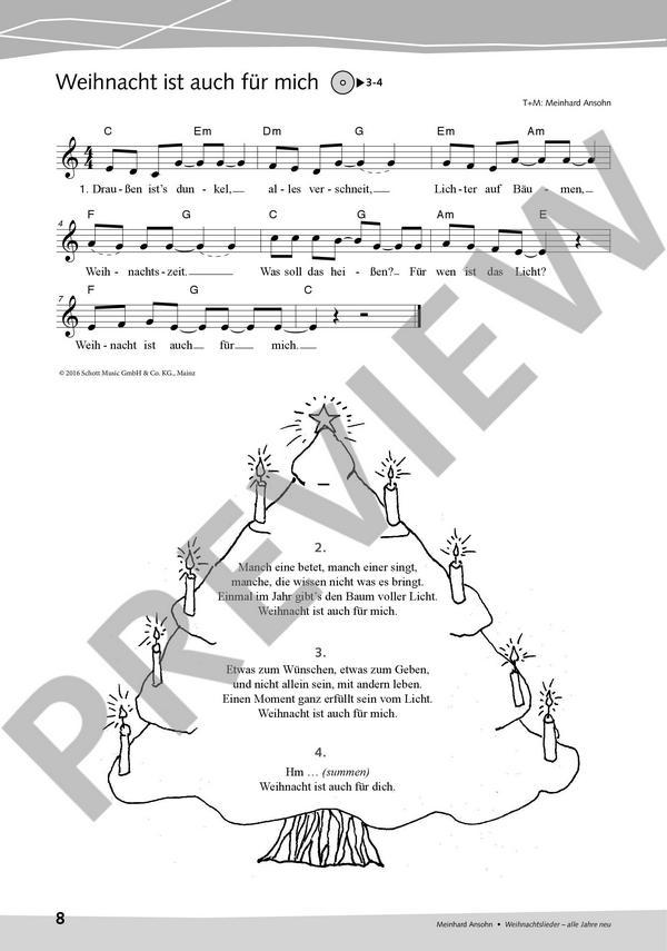 Ansohn, Meinhard, ed 40 neue Weihnachtslieder und Chorideen mit Hinweisen und Anregungen zu den einzelnen Liedern Licht und Sterne: Leuchte, mein Licht Weihnacht ist auch für mich Da ist ein Licht Der Weihnachtsstern Sterne Engel und Glocken: Engel Glockenkanon Nicht nur zur Weihnachtszeit Krippe und Stall: Komm, komm, komm nach Bethlehem Die Krippe von Bethlehem Entre le boeuf et l' âne gris (Zwischen Ochs und Esel) Gdy sliczna Panna (Im kleinen Stall) Quanno nascette Ninno (Es war in Bethlehem) While Shepherds Watched their Flocks Mary had a Baby Schenken und Baum: Das Lied vom Schenken Es ist wieder mal so weit Alles wie verzaubert Weihnachtsrap O Tannenbaum, du trägst ein' grünen Zweig Morgen, Kinder Advent Alle Jahre neu: Weihnachtszeit Stille Nacht, schlafe sacht Alle Jahre neu Der Weihnachtstrommler ernst jandls weihnachtslied Frohe Weihnachten: Frohe Weihnacht Joyeux Noel Feliz Navidad Gatatumba (In der schönen Weihnachtszeit) Nu är det jul igen (Weihnachten kommt schon wieder) We Wish you a Merry Christmas Weihnachtsfrieden Winter und Neujahr: Jingle Bells Rudolph, the Rednosed Reindeer Rudolf, der Weihnachtsheld Frosty, the Snowman Der Schneemann Winter Wonderland Weihnachten im weißen Winterland Das Kein-Schnee-Lied Neujahrsnacht