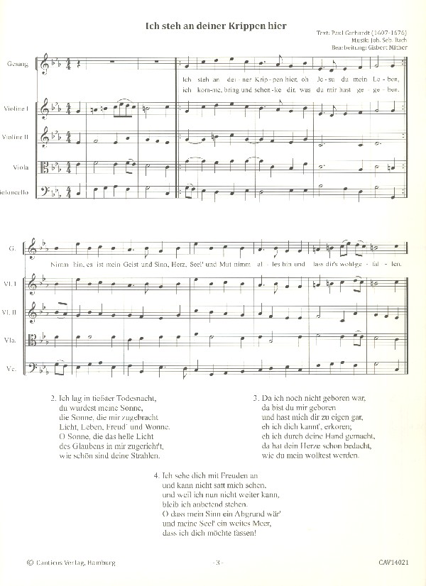Die Besetzungen der einzelnen Lieder sind unterschiedlich und sehr variabel. In den einzelnen Stimmen wurden bestimmte Besetzungsoptionen zusammengefasst. Es ist möglich, die obere Stimme (über der Gesangstimme) wegzulassen. Ich steh an deiner Krippen hier Süßer die Glocken nie klingen Auf dem Berge da wehet der Wind Tochter Zion Leise rieselt der Schnee O Tannenbaum, du trägst ein grünen Zweig Weihnacht Es blühen die Maien Still, weils Kindlein schlafen will