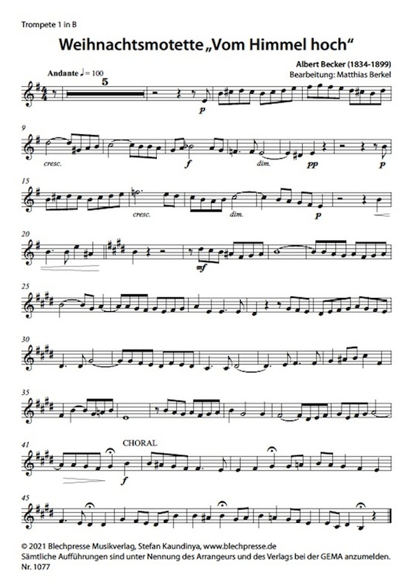 Berkel, Matthias, arr. In dieser Motette beginnt Becker mit einem ruhig bewegten Moll-Teil, dessen Dur-Variante er im zweiten Abschnitt mit der Choralmelodie Vom Himmel hoch verknüpft. Abschließend folgt sein eigener romantischer Satz des Chorals. Ein wirklich weihnachtlich-festliches Stück!