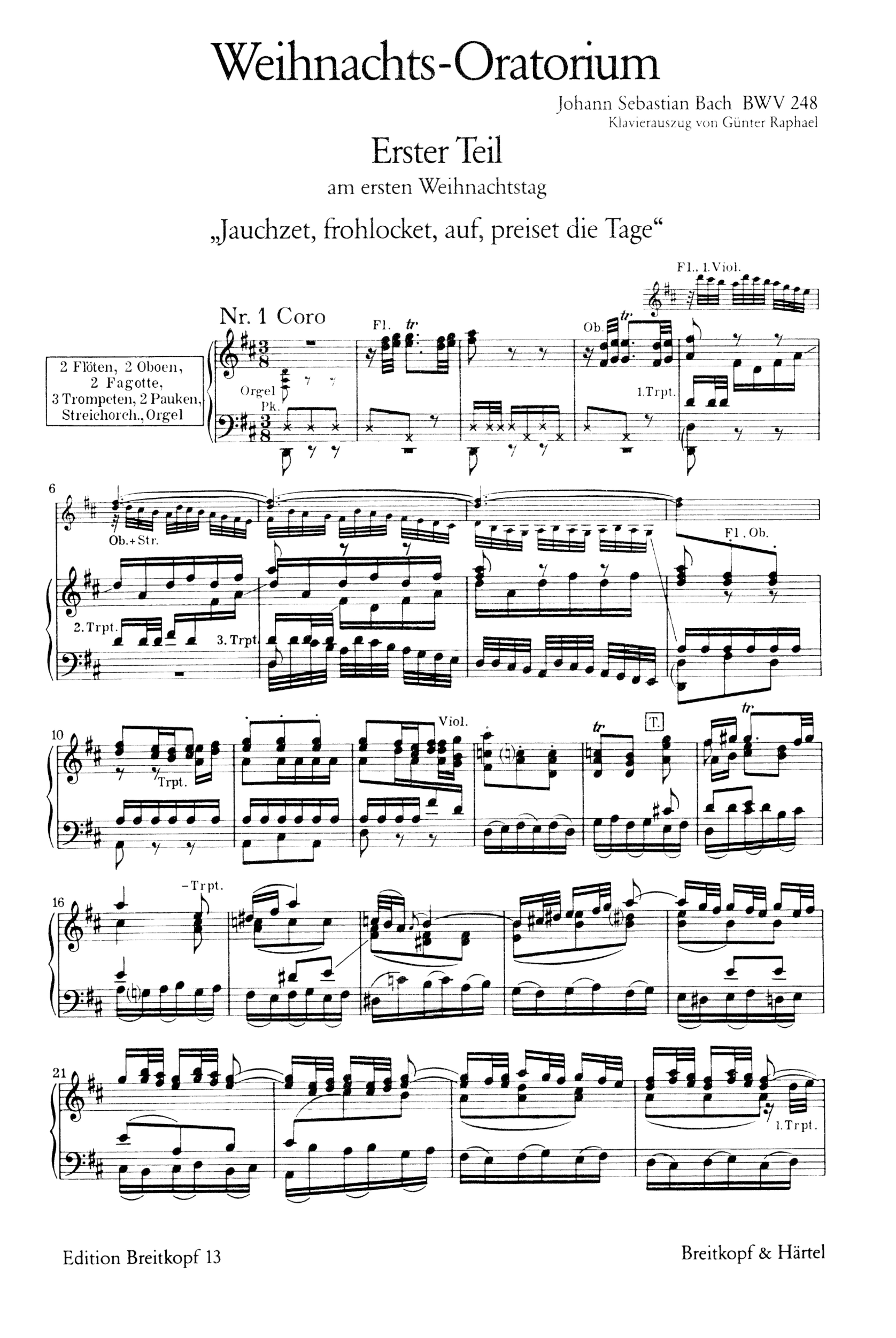 Raphael, Günter, ed Für die Komposition des Weihnachts-Oratoriums bediente sich Johann Sebastian Bach wie auch bei anderen großen Vokalwerken des Parodieverfahrens, d. h., er griff auf früher komponierte Sätze zurück (in diesem Fall meist aus den Glückwunschkantaten BWV 213 und 214) und passte sie kunstvoll dem neuen Text an. Mit der musikalischen Gestaltung dürfte Bach in der Adventszeit 1734 begonnen haben. Über die erste Aufführung an den Festtagen Ende 1734 und Anfang 1735 hinaus gelten weitere Aufführungen zu Bachs Lebzeiten als sehr wahrscheinlich, da das originale, mitunter autographe Stimmenmaterial Spuren regen Gebrauchs zeigt.