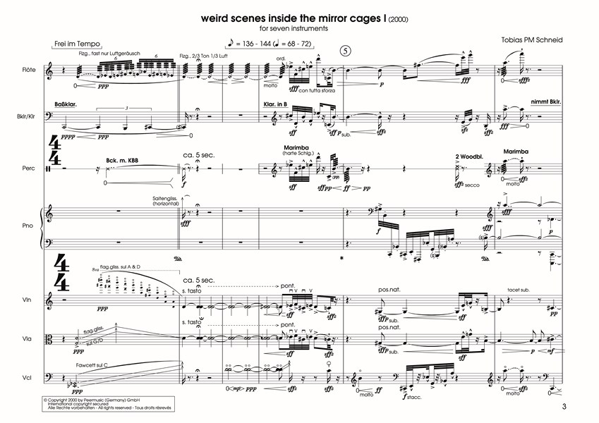 Flöte, Baßklarinette (Klarinette), Klavier, Schlagzeug, Violine, Viola, Violoncello