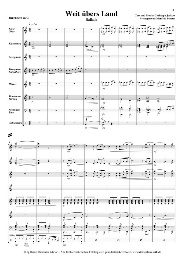 Schenk, Manfred, arr. Ballade Der Komponist Christoph Jarkow fordert uns auf, die Augen zu schließen und nimmt uns mit seiner wunderschönen Ballade "Weit übers Land" auf eine harmonische Reise, die sensibel weiche und große Bilder zeichnet. Die wunderschöne Melodieführung mit Ohrwurmgarantie, unterlegt mit einem modernen Rhythmus, wurde von Arrangeur Manfred Schenk in ein gefühlvolles Arrangement verpackt, das auch in kleiner Besetzung wirkungsvoll ist. "Weit übers Land" ist nicht nur das perfekte Stück, um das Publikum träumen zu lassen, sondern ist auch leicht spielbar und eignet sich deshalb besonders, um Nachwuchsmusiker mit ins Orchester einzubinden. Zu dem Werk gibt es auch einen optionalen Gesangstext, der vom Solisten einfühlsam vorgetragen werden darf.