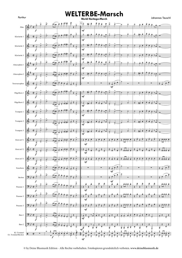 Marsch Der "Welterbe-Marsch" (World Heritage March) ist ein dynamischer, schwungvoller Marsch aus der Feder des österreichischen Komponisten Johannes Teuschl. Inspiriert durch seine Wahlheimat, das Weltkulturerbe Wachau, schuf er einen klassisch aufgebauten Marsch in drei Teilen. Dem verspielten ersten Teil in B-Dur folgt ein kurzes Bass-Solo in Moll, das aber wieder zur Ursprungstonart zurückfindet. Das Trio bringt ein harmonisches Tenor- und Baritonsolo und überrascht bei der Wiederholung mit Swing-Begleitung und Big-Band-Sound. Leicht spielbar und sowohl für kleine als auch große Besetzungen geeignet, gehört dieser Marsch sicher selbst bald zum Blasmusik-Welterbe.