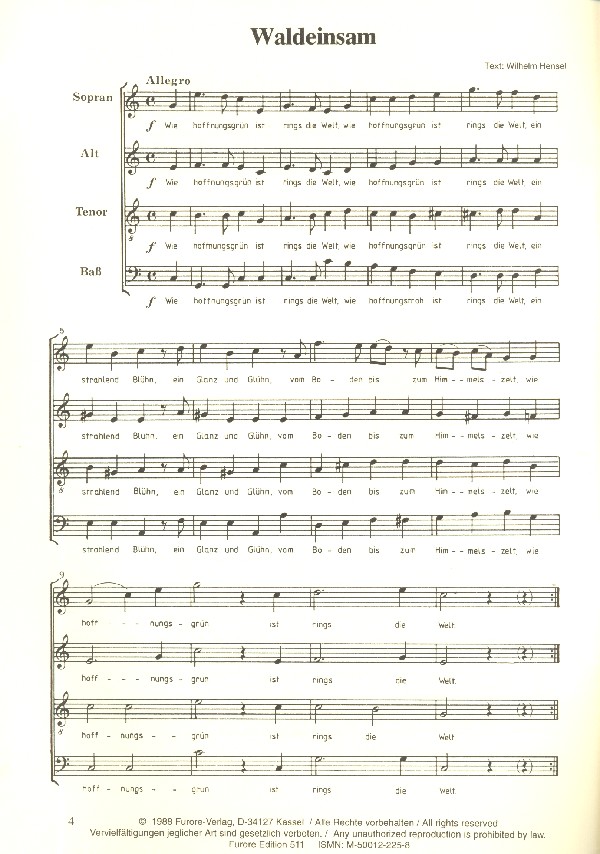 Waldeinsam ('Wie hoffnungsgrün ist rings die Welt') Morgendämmerung ('Wer recht in Freuden wandern will') Seid gegrüßt ('Seid gegrüßt mit Frühlingswonne')