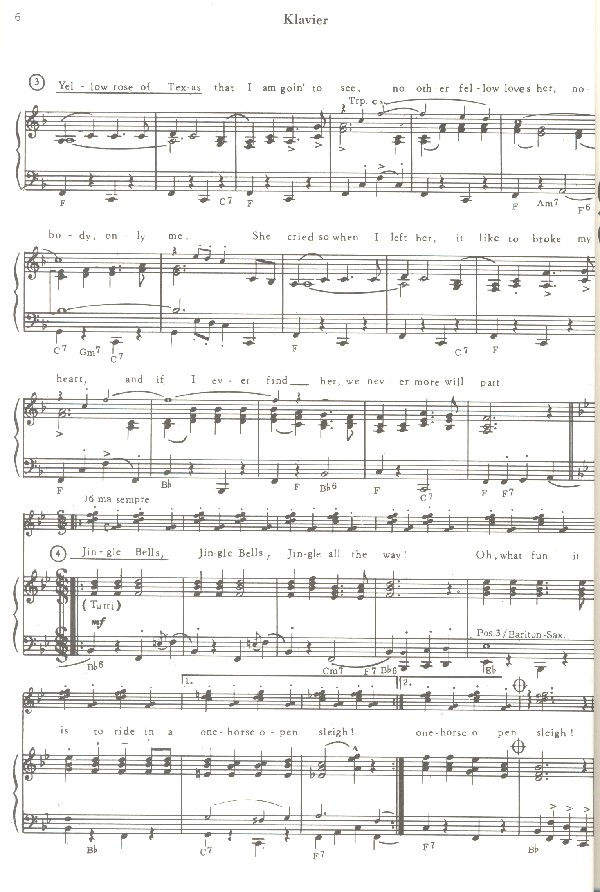 1.Old Billy's Saloon USA Teil A, Foxtrot: She'll be comin' round the mountain Billy boy The yellow rose of Texas Jingle Bells Sloop John B. When the Saints go marching in Teil B, Marsch-Fox: When Johnny comes marching home Frankie and Johnnie I've been workin' on the railroad John Brown's Body There's a tavern in the town 2. Messer, Lassos und rauchende Colts USA Teil A, Foxtrot: Oh, Susanna Gloryland Camptown Races Yankee Doodle Dixie Teil B, Med.-Swing: American Patrol Old MacDonald has a farm The girl I left behind me Skip to my Lou Polly Wolly Doodle- Goodnight ladies 3. Alte Songs der Neuen Welt USA Teil A, Med.-Swing: Joshua fit Old folks at home Down by the riverside Old Black Joe Little brown jug Michael He's got the whole world in His hands Teil B, Slow: Carry me back to Old Virginny Swing low, sweet Chariot Nowbody knows the trouble I've seen House of the Rising sun Tom Dooley Just a closer walk with Thee 4. Unter Cowboys, Ranchern und Indianern USA Teil A, Mod.-Swing: My D Red River Valley Home on the range Shenandoah My Old Kentucky Home Teil B Walzer: In the good old summertime On top of old smoky Careless love The streets of Laredo Beautiful dreamer Down in the valley After the ball 5. Ale, Whisky and Irish Coffee England, Schottland, Irland Teil A, Langsamer Walze Rolling home Believe me Teil B, Walzer: Daisy Bell (Bicycle built for two) The last rose of summer Long, long ago My Bonnie lies over the ocean 6. Zu Gast bei MacIntosh, O'Connor und Smith Schottland, Irland, Engla Early one morning The drunken Sailor Scotland the brave The Campbells are Comin' Three blind mice A jolly good fellow Teil B, Slow-Beat: Londonderry Air Loch Lomond Annie Laurie Auld lang syne 7.Vom Fjord zum Fleet Schweden, Norwegen, Dänemark, Holland Teil A, Walzer: Värmlan Per Spelman Dansken har Sejer vundet Holder du af mig Spinn dotter min Och Jungfrun Å jänta å ja' (Värmlandspolska) Teil B, Marsch: Overal, waar de Meisjes zijn Ach lieve Meisjes truer maar niet Om dat het zoo lekker is En hoeperdehhoep Zoo lang als de lepel Sarie Marais Hop falderiere -Houdt er den moed maar in Hallé-Hallo! O ja, wij willen We gaan nog niet naar huis 8. Unter der Tricolore Frankreich Teil A, Langsamer Walzer: Plaisir d'amo Au clair de la lune Ma Normandie Chevaliers de la table ronde Teil B, Marsch: Trois jeun' tambours (Le joli tombour) Alouette Vive l'amor Sur le pont d'Avignon Auprès de ma blonde Frère Jaques Marche des rois Can -Can 9. Durch die Alpen Österreich, Schweiz Teil A, Walzer: Schneewalzer Du alter Stephansturm Heidschi-Bumbeidschi Erzherzog-Johann -Jodler Zwoa Sterndeln am Himmel Zillertal, du bist mei Freud Zu Mantua O du mein Österreich Teil B, Polka: Von Luzern uf Weggis zue Min Vatter ischt en Appenzeller Der Tod von Basel La jardinière du roi Im Aargäu sind zwoi Liebi Noi siamo tre sorelle Der alte Berner Marsch 10. Piroschkas Heimat Ungarn Teil A, Slow-Beat: Magasan repül aru Ritka Búza, ritka árpa Csak egy kislány Akácos út Erik á Teil B, Foxtrott: Maros vize folyik csendesen Vörös bort ittam a Jó estét kivánok Tiz pár csokat egy vegböl Ha jö' a nyár dinomdánom 11. Na zdrowje, Towarischtsch Rußland Teil A, Me at: Moskauer Nächte Einsames Glöckchen Serze Abendglocken Schwarze Augen Teil B, Polka: Original Kasatschok Katjusha Jamschtschik Zwei Gitarren Bublitschki Kosakenpatrouille Der Mond scheint Kalinka 12. Jüdische Spezialitäten Teil A, Beguine: A jiddische Mame Rosinkes und Mandeln Auf dem Pripetschek Kol Nidre Tum Balalaika Teil B, Hora-Fox: Haveinu Scholem Alejchem Hot a Jid a Waibele Chave Masel-Tow Jidl mit dem Fidl O Josl, Josl Hava Nagila 13. Vino- Amore-Canzone Italien Teil A, Beguine: Tiritomba La Livornese La Violetta Finestra bassa Santa Lucia Teil B, Walzer: La Villanella (Bella Bimba) Tesoro mio -La treccia Bionda Vieni sul mar Donna é mobile 14. Unter südlicher Sonne Spanien, Haiti, Mexico Teil A, Beguine: La Golondrina Chouconne La Paloma Teil B, Walzer: Cielito lindo Espana I La Cachucha Layeta El Vito Espana II 15. Mit Bongos und Maraccas Mexiko, Brasilien, Kuba Teil A, Cha-Cha: Kreolisches Wiegen Adelita Mulher rendeira Guantanamera Teil B, Samba: La Cucaracha La Bamba Mexican Hat Dance Jarabe Tapatio La Raspa 16. Durch exotische Länder Hawaii, Japan, Indonesien, Türkei, Arabien, Afrika Teil A, Mod.- Suliram Sakura Kum ba ya Teil B, Swing-Fox: Song of India (Hindulied) Hare Krishna Mantra Üsküdara Ankara'nin tasina bak Ah Ya Zein- Wimoweh