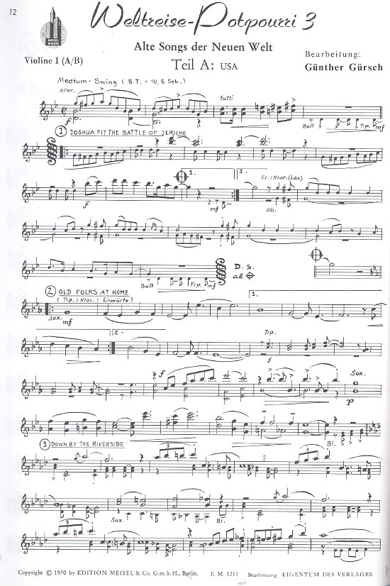 Gürsch, Günther, arr. 1.Old Billy's Saloon USA Teil A, Foxtrot: She'll be comin' round the mountain Billy boy The yellow rose of Texas Jingle Bells Sloop John B. When the Saints go marching in Teil B, Marsch-Fox: When Johnny comes marching home Frankie and Johnnie I've been workin' on the railroad John Brown's Body There's a tavern in the town 2. Messer, Lassos und rauchende Colts USA Teil A, Foxtrot: Oh, Susanna Gloryland Camptown Races Yankee Doodle Dixie Teil B, Med.-Swing: American Patrol Old MacDonald has a farm The girl I left behind me Skip to my Lou Polly Wolly Doodle- Goodnight ladies 3. Alte Songs der Neuen Welt USA Teil A, Med.-Swing: Joshua fit Old folks at home Down by the riverside Old Black Joe Little brown jug Michael He's got the whole world in His hands Teil B, Slow: Carry me back to Old Virginny Swing low, sweet Chariot Nowbody knows the trouble I've seen House of the Rising sun Tom Dooley Just a closer walk with Thee 4. Unter Cowboys, Ranchern und Indianern USA Teil A, Mod.-Swing: My D Red River Valley Home on the range Shenandoah My Old Kentucky Home Teil B Walzer: In the good old summertime On top of old smoky Careless love The streets of Laredo Beautiful dreamer Down in the valley After the ball 5. Ale, Whisky and Irish Coffee England, Schottland, Irland Teil A, Langsamer Walze Rolling home Believe me Teil B, Walzer: Daisy Bell (Bicycle built for two) The last rose of summer Long, long ago My Bonnie lies over the ocean 6. Zu Gast bei MacIntosh, O'Connor und Smith Schottland, Irland, Engla Early one morning The drunken Sailor Scotland the brave The Campbells are Comin' Three blind mice A jolly good fellow Teil B, Slow-Beat: Londonderry Air Loch Lomond Annie Laurie Auld lang syne 7.Vom Fjord zum Fleet Schweden, Norwegen, Dänemark, Holland Teil A, Walzer: Värmlan Per Spelman Dansken har Sejer vundet Holder du af mig Spinn dotter min Och Jungfrun Å jänta å ja' (Värmlandspolska) Teil B, Marsch: Overal, waar de Meisjes zijn Ach lieve Meisjes truer maar niet Om dat het zoo lekker is En hoeperdehhoep Zoo lang als de lepel Sarie Marais Hop falderiere -Houdt er den moed maar in Hallé-Hallo! O ja, wij willen We gaan nog niet naar huis 8. Unter der Tricolore Frankreich Teil A, Langsamer Walzer: Plaisir d'amo Au clair de la lune Ma Normandie Chevaliers de la table ronde Teil B, Marsch: Trois jeun' tambours (Le joli tombour) Alouette Vive l'amor Sur le pont d'Avignon Auprès de ma blonde Frère Jaques Marche des rois Can -Can 9. Durch die Alpen Österreich, Schweiz Teil A, Walzer: Schneewalzer Du alter Stephansturm Heidschi-Bumbeidschi Erzherzog-Johann -Jodler Zwoa Sterndeln am Himmel Zillertal, du bist mei Freud Zu Mantua O du mein Österreich Teil B, Polka: Von Luzern uf Weggis zue Min Vatter ischt en Appenzeller Der Tod von Basel La jardinière du roi Im Aargäu sind zwoi Liebi Noi siamo tre sorelle Der alte Berner Marsch 10. Piroschkas Heimat Ungarn Teil A, Slow-Beat: Magasan repül aru Ritka Búza, ritka árpa Csak egy kislány Akácos út Erik á Teil B, Foxtrott: Maros vize folyik csendesen Vörös bort ittam a Jó estét kivánok Tiz pár csokat egy vegböl Ha jö' a nyár dinomdánom 11. Na zdrowje, Towarischtsch Rußland Teil A, Me at: Moskauer Nächte Einsames Glöckchen Serze Abendglocken Schwarze Augen Teil B, Polka: Original Kasatschok Katjusha Jamschtschik Zwei Gitarren Bublitschki Kosakenpatrouille Der Mond scheint Kalinka 12. Jüdische Spezialitäten Teil A, Beguine: A jiddische Mame Rosinkes und Mandeln Auf dem Pripetschek Kol Nidre Tum Balalaika Teil B, Hora-Fox: Haveinu Scholem Alejchem Hot a Jid a Waibele Chave Masel-Tow Jidl mit dem Fidl O Josl, Josl Hava Nagila 13. Vino- Amore-Canzone Italien Teil A, Beguine: Tiritomba La Livornese La Violetta Finestra bassa Santa Lucia Teil B, Walzer: La Villanella (Bella Bimba) Tesoro mio -La treccia Bionda Vieni sul mar Donna é mobile 14. Unter südlicher Sonne Spanien, Haiti, Mexico Teil A, Beguine: La Golondrina Chouconne La Paloma Teil B, Walzer: Cielito lindo Espana I La Cachucha Layeta El Vito Espana II 15. Mit Bongos und Maraccas Mexiko, Brasilien, Kuba Teil A, Cha-Cha: Kreolisches Wiegen Adelita Mulher rendeira Guantanamera Teil B, Samba: La Cucaracha La Bamba Mexican Hat Dance Jarabe Tapatio La Raspa 16. Durch exotische Länder Hawaii, Japan, Indonesien, Türkei, Arabien, Afrika Teil A, Mod.- Suliram Sakura Kum ba ya Teil B, Swing-Fox: Song of India (Hindulied) Hare Krishna Mantra Üsküdara Ankara'nin tasina bak Ah Ya Zein- Wimoweh